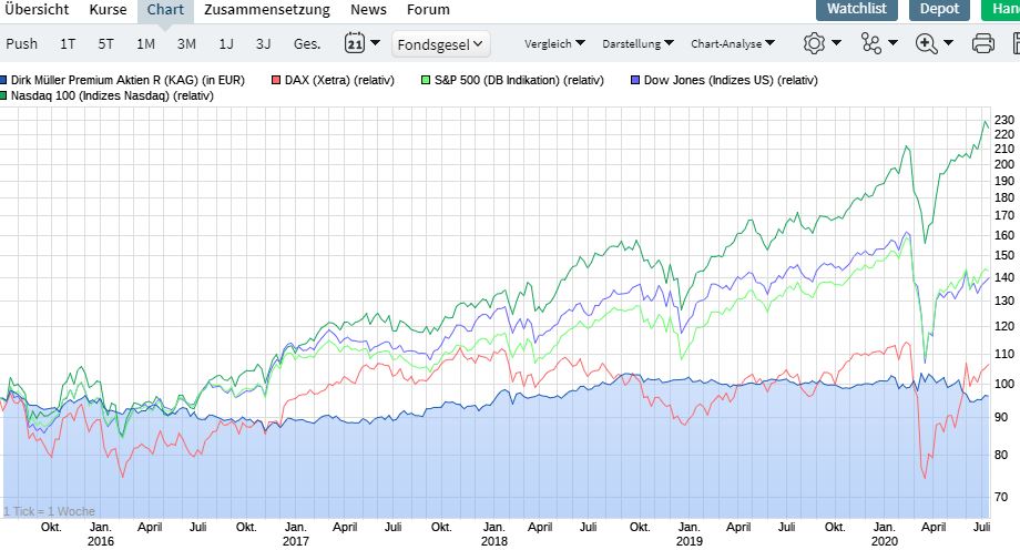 D.h. jeder ETF auf die o.g. Indizes wäre besser gelaufen und obwohl er mit 76% im US-Markt investiert ist, schlägt selbst der DAX seinen Fond! Braucht man das noch näher zu kommentieren?