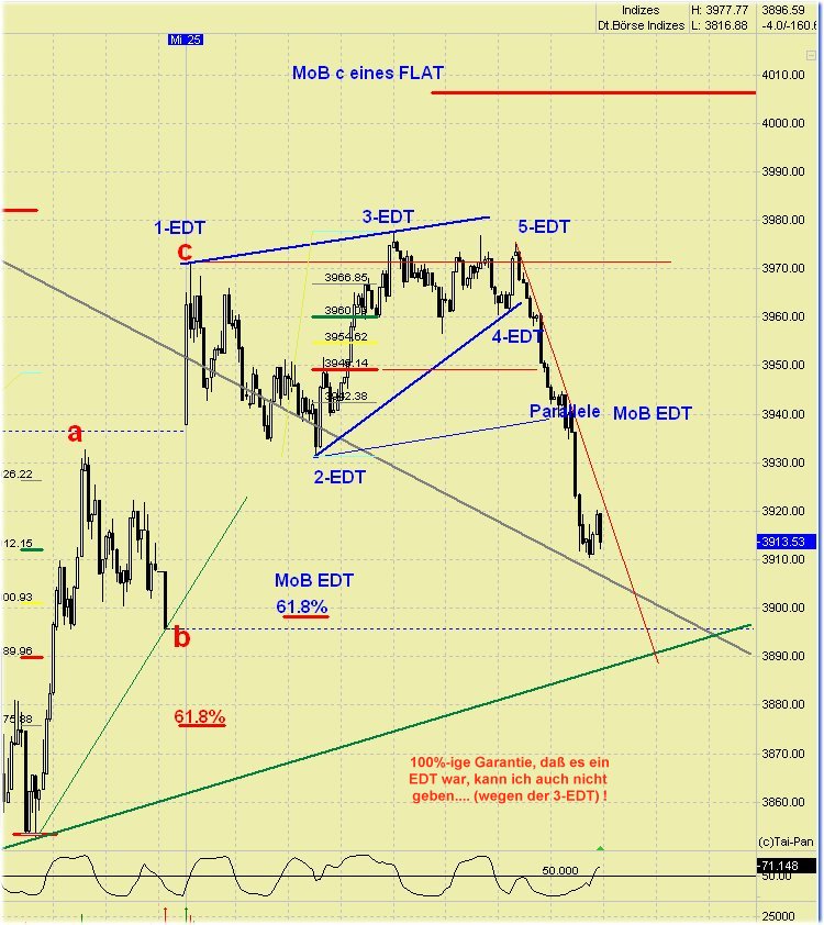 als ich das mit der Sorge vor dem "verkürzten EDT" schrieb (die berühmten Pferde, die vor der Apotheke kotzen, also das Ziel nicht erreichen), hätte ich den Short schon unter die  neue Keillinie also bei 3960 hinlegen müssen/können/sollen .... aber das ging nicht so schnell..... ;-)