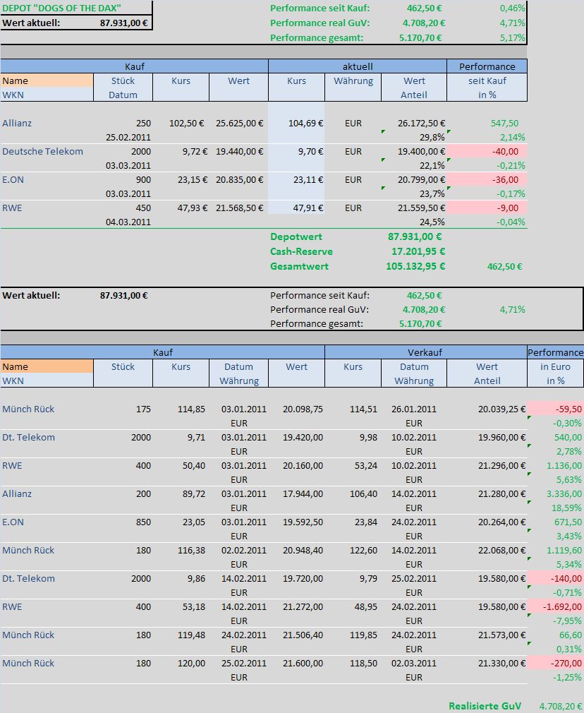 Hier findet sich eine ähnliche Situation wie bei E.ON. Die Aktien wurden gestern verkauft. Anlass war zum einen gestern ein neues 4-Wochen-Tief, zum anderen kreuzte der GD100 den Kurs von oben nach unten, nach dem bereits am Vortag dies schon beim GD50 der Fall war.