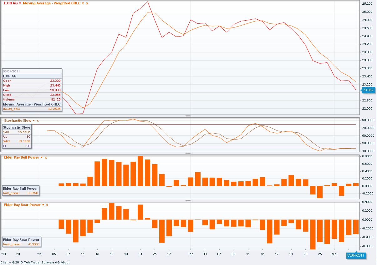 E.ON wurde gestern verkauft. Anlass war zum einen gestern ein neues 4-Wochen-Tief, zum anderen kreuzte der GD38 den Kurs von oben nach unten.
