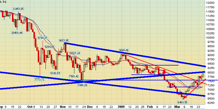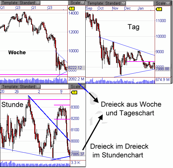 Siehe der Dow und die Dreieckslinie ganz unten die jeden Tag um einige Punkte unterboten wurde. Das Dreieck muss natürlich entsprechend angepasst werden, verliert aber nicht seine Berechtigung.