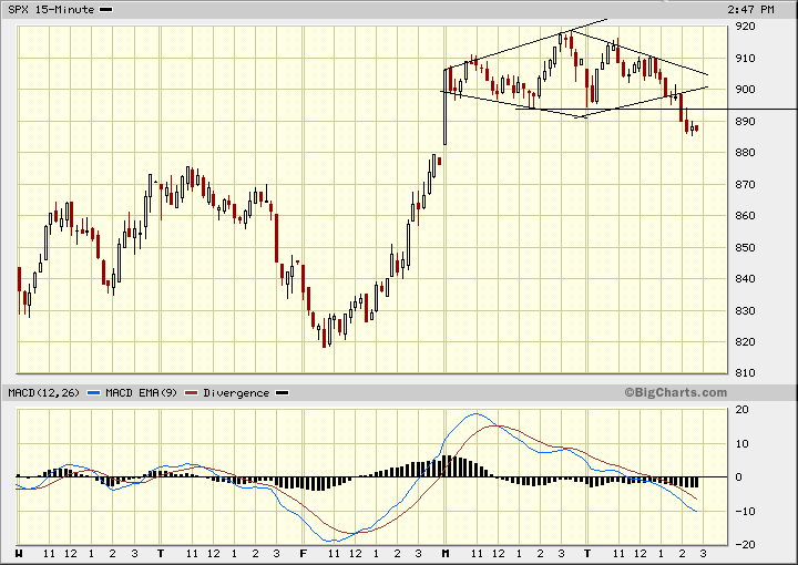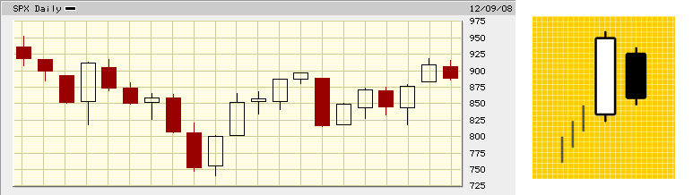 Auch am Tagesende sieht es nicht gut aus. Wir bleiben unter der Nackenlinie und im Tageschart des SPX wird ein Verkaufssignal generiert, ein sogenannter Bearish Harami.