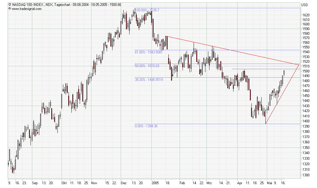 | <!--StartFragment -->Die US Indizes konnten den Handel heute positiv eröffnen und konnten die Rallye intraday bei deutlich fallendem Ölpreis fortsetzen. Dabei bricht der Nasdaq klar über das Widerstandscluster bei 1992-2000 Punkten nach oben aus und kann zum Handelsende um 1,3% auf 2031 Punkte anstiegen. Der mittelfristige Abwärtstrend wird dabei ebenfalls nach oben gebrochen. Auch der Dow konnte die Rallye der Vortage fortsetzen und erreicht ein neues relatives Hoch. Bei einem Stand von 10.464 Punkten wird der Widerstand bei 10400 Punkten zum Handelsende klar gebrochen, der Index legt um 1,3 % zu. Getragen wurde die Erholung durch den Netzwerk- und Internetsektor, relative Schwäche zeigte sich bei fallendem Ölpreis im Ölsektor. Entsprechend gehörte heute die Aktie von Exxon (-0,4%) wieder zu den Verlieren im Dow Jones, Hewlett Packard zieht zum Handelsende um 4,6 % nach oben durch. Relativ schwach tendierte als einer der Verlierer im Nasdaq 100 nach dem Anstieg der Vortage Amgen (-0,9%), deutlich erholen konnten sich die Kurse bei Symantec (+4,7%) und Synopsys (+3,9%). Aktuelle Tagescharts (1 Kerze = 1 Tag) sowie 60-min Chartausschnitt ![]() |