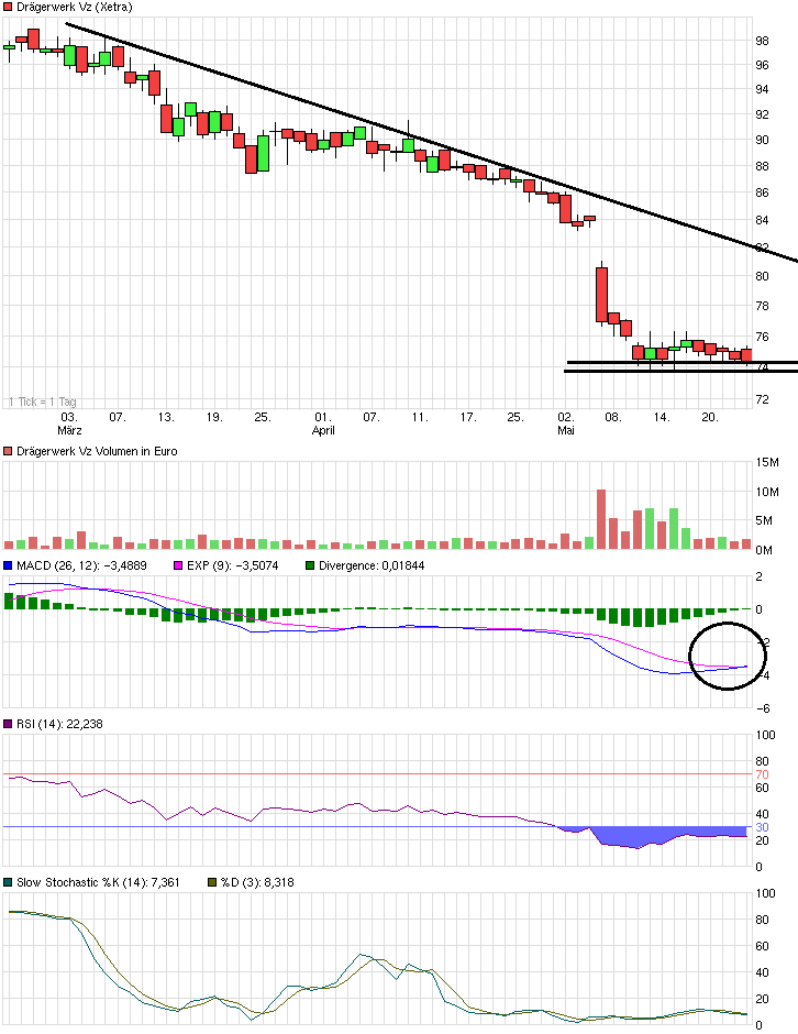 Seit 2012 gehen die Gewinne im Grunde stetig zurück. Q1/14 dann sogar sehr deutlich. Teilweise war das auch währungsbedingt, aber Q2 dürfte diesbezüglich sogar noch schlechter werden als Q1, da der Euro in AprilMai neue Höchststände erreichte. Drägerwerk war zudem in den letzten 20 Jahren immer stark frühzyklisch. Kann durchaus sein, dass die Gewinnrückgänge sogar ein Warnzeichen darüber hinaus sind. Wobei ich das erstmal abwarten würde, wie sich dann Q3+Q4 entwickeln. Dennoch erscheint mir ein EPS von 7 € eher unwahrscheinlich. Allerdings hast du schon recht. Teuer wäre Drägerwerk auch bei einem EPS von 6 € nicht (meine Erwartung). KGV von 12,5 ist immernoch im Normalfall sogar günstig, wobei sowas auf Aktien mit positver Gewinndynamik zutrifft. Wenn die Gewinndynamik abwärts gerichtet ist, wirkt ein KGV von 12,5 nicht mehr allzu günstig.