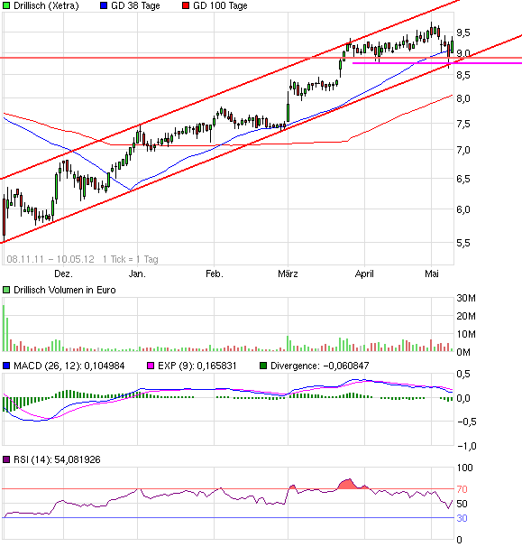 Drillisch: Es bleibt bei der Kaufempfehlung - 27.04.2012 (www.4investors.de) => ".. Die Analysten der Commerzbank haben ihre Kaufempfehlung für die Drillisch-Aktie im Vorfeld der Quartalszahlen bestätigt. Das Kursziel wird bei 10,50 Euro gesehen. Für die Zahlen, die am 11. Mai veröffentlicht werden, erwarten die Analysten von Drillisch unter anderem einen Umsatz von rund 79 Millionen Euro sowie einen Gewinn je Aktie von 0,11 Euro. Zudem rechnet die Commerzbank damit, dass Drillisch die Prognose anheben wird. Die EBITDA-Prognose des Unternehmens sehe zu konservativ aus. Eine höhere Prognose für 2012 könnte die Unterbewertung der Aktie zeigen, heißt es.