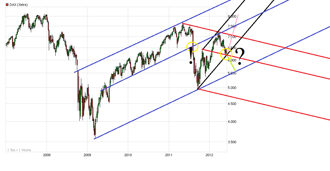Für die Bullen ist es sehr wichtig das die 200 Tageslinie verteidigt wird und man auch in dem seit Mitte 2011 relativ steil steigenden schwarzen Aufw.trendkanal bleibt. Die wünschen sich, daß hier jetzt der Rebound nach oben einsetzt, die Welle 4 dann abgeschlossen wäre und man die Welle 5 nach oben beginnt Richtung neuer Jahreshöchststände. Von daher ist es kaum verwunderlich, wenn in der Nähe der Marke also wieder Käufer gestern aufgesprungen sind. Das Problem ist nur: Was passiert, wenn man durchsackt? Ein rauskippen aus einem Aufw.trend wo die meisten Leute denken er wird verteidigt hat schnell mal üble Folgen. Man denke an Mitte 2011, wo man aus dem blauen Aufw.trendkanal gefallen ist, man damit jede Menge SL ausgelöst hat und das Sentiment damit nochmal klar weiter eingeknickt war bis zum Sell Off um die 5000 Punkte. Sollte der DAX aus dem schwarzen Aufw.trendkanal kippen, dann könnte es also weiter runtergehen Richtungg 5500 Punkte, d.h. weiter runter bis zum blauen Aufw.trend der seit 2009 steigt und weniger steil ist als der aktuelle schwarze Aufw.trend. Also mir wäre es defintiv lieber man dreht bald wieder aus dem 6175/200er Bereich nach oben und alle Probleme in Europa lösen sich in Wohlgefallen auf. Die Griechen kommen bei der Wahl zur Vernunft und alle PIIGS finden ab dann sparen toll. Aber darauf alles zu wetten ist riskant. Da bleibe ich erstmal vorsichtig und warte mal ab was die Griechen machen und was die Spanier unternehmen, um ihre Banken zu retten und ihre Staatsanleihen wieder mit niedrigeren Zinsen loszuschlagen. Die Toreros brauchen ja nur "bescheidene" 350 Mrd.€..... http://www.finanznachrichten.de/...-braucht-wohl-euro-350-mrd-009.htm