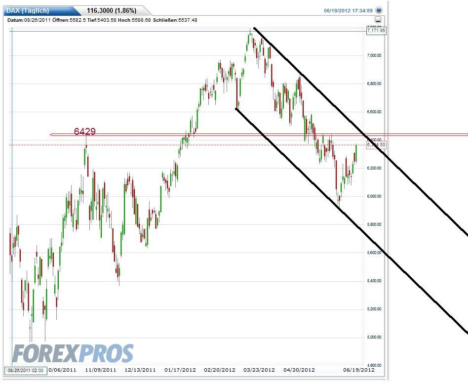 Die Oberkante des laufenden Abw.trendkanals, das 38,2%Retracement der Abwärtsbewegung seit dem Jahrestop und die Widerstandzone roundabout 6430/6450, an der man zweimal im Mai gescheitert ist sollte man aber schon als Crunch Marken auf dem Schirm haben wenn man sich mit CT beschäftigt. Besonders wenn die geballt nun in enger Nähe zusammenfallen. Also fast überall kann man seit längerm seitens der Charttechniker lesen und hören, daß genau dieser Bereich 6430+/-20 Punkte für sie relevant ist wenn es zu einer Erholung im DAX kommt, da es bullisch wird solbald man diesen Bereich nachhaltig hinter sich lassen könnte. (z.B. http://www.boerse.de/geldanlage/...in-der-neutralen-Zone-aber/7295882 , http://www.stock-world.de/analysen/..._wir_zurest_5818_oder_6400.html , http://www.godmode-trader.de/nachricht/...ce-Index-X,a2857323,b1.html u.v. m.)