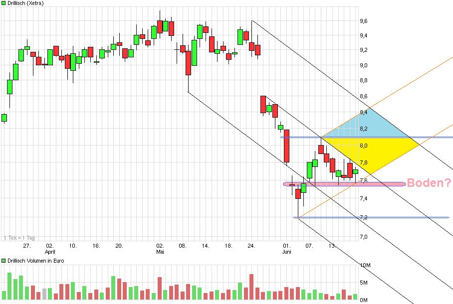 Ich habe lediglich gewisse Parallelprojektionen ober- und unterhalb der auffälligen Abwärtslinie (dicke rote) gemacht die sich jüngst ausgebildet hat. Auf der anderen Seite habe ich an das jüngste Top (ca. 8,1) eine Parallelprojektion gemacht zu der Linie die sich ergibt wenn man die beiden Junitiefs verbindet (dickie braune). Das sind für mich im kurzfristigen Bereich zunächstmal interessante Linien. Ich halte es nicht für verkehrt, wenn man gewissen potenzielle Entwicklungsmöglichkeiten frühzeitig auf dem Radar hat, auch wenn sie vielleicht dann später nicht mehr bestätigt werden. Ich behaupte somit nicht, daß es bereits neu Trendkanäle, etc. wären, sondern einfach nur, daß man mal ein Auge darauf behalten sollte. Mittel- bis langfristig hat sich nichts deswegen bislang geändert in meiner Betrachtung. Ich will aber jetzt nicht eine längere Diskussionen über Charttechnik führen, um das Themenloch zu stopfen was hier vielleicht mangels frischer Neuigkeiten über Drillisch gerade besteht. Jeder hat eben seine Art Charts zu beobachten. Wenn jemand Dinge anders einschätzt als ich habe ich auch kein Problem damit.