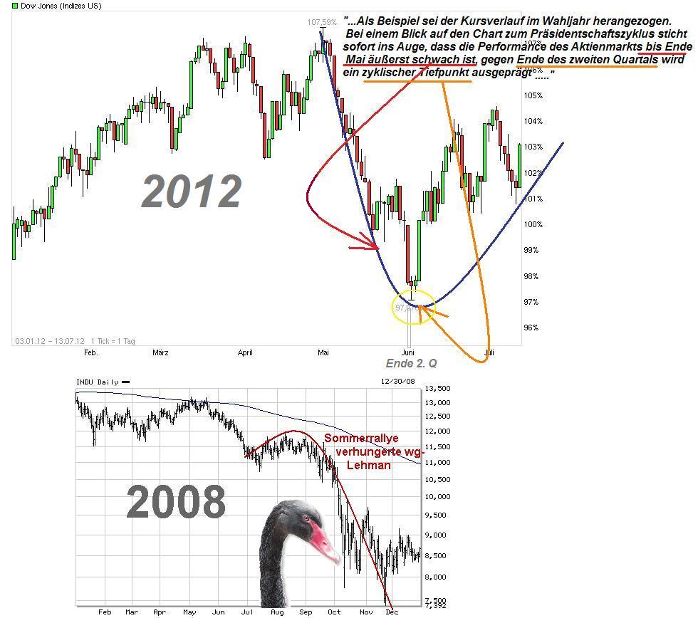wirklich einer den man als Anleger auf der Rechnung haben sollte. Das hat sich sehr oft gelohnt danach zu handeln. Im Moment läuft ja auch wieder das bekannte Muster, d.h. direkt nach Ende des 2.Q. wurde fleißig gekauft und man hofft, daß sich diese Kursanstiege im Sommer auch möglichst hoch halten und im Herbst zur Wahl hin dann weiter hochgekauft wird, wenn möglich bis zu neuen Jahreshochs. Soweit so schön, wenn es so käme. Problem ist halt nur, daß es auch immer wieder Ausreißerjahre gab, wie z.B. das letzte Wahljahr 2008. Da ging der Schuß im 2.Hj. nach hinten los. Von daher sollte man sich nicht zu sehr auf sowas verlassen und auch die die Augen nach schwarzen Schwänen offenhalten
