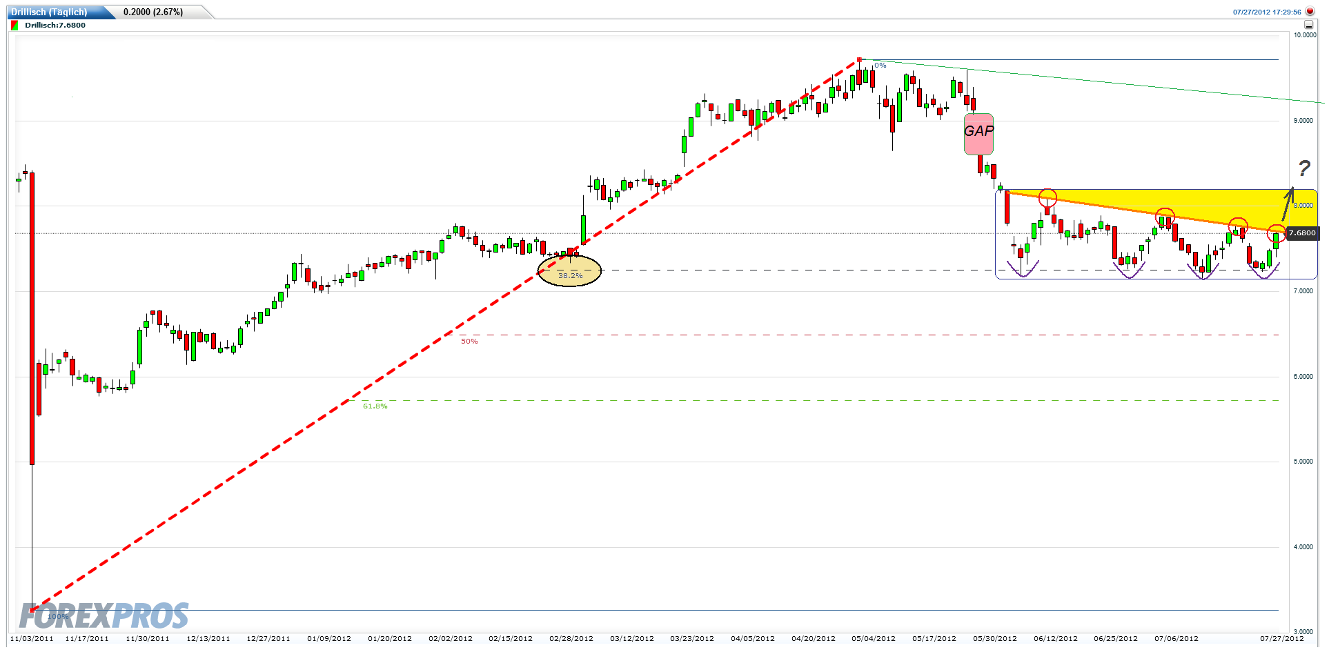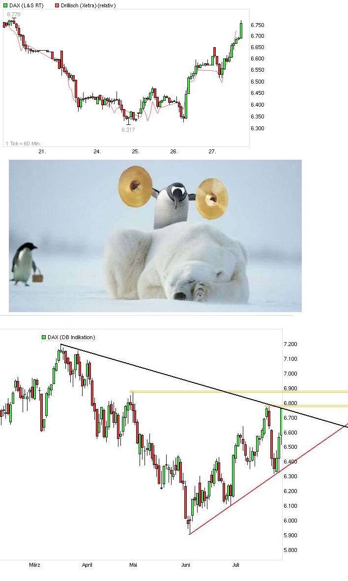 Die letzten beiden Tage haben auf der Short-Seite schwerste Wirkungstreffer erzielt. Das Draghi den eigentlichen Aufgabenbereich der EZB so vergewaltigen würde hatten doch viele Leute so nicht auf der Rechnung gehabt. Der DAX ist nicht nur an der Aufw.trendline nach oben abgeprallt die seit Juni steigt, sondern hat sich dabei auch wieder mit Schwung von der 200 Tagelinie nach oben abgestoßen. Mit dieser Heftigkeit hatten viele nicht gerechnet. Über 350 Punkte Anstieg in kaum 2 Tagen. Das war echt mal jetzt wieder ein fetter Squeeze. Heute wäre noch ein Hoffnungsschimmer für die Bären gewesen, wenn man im Bereich 6620/40 zum halten gekommen wäre und wieder von da nach unter abgedreht wäre. Daraus wurde nichts und so ist auch die von vielen Leuten noch für möglich Ausbildung der rechten Schulter einer SKS nicht mehr zu erwarten. In diesem bullischen Sog hat sich auch endlich Drillisch wieder aufgemacht sich etwas zu erheben innerhalb des ohnehin sehr starken Gesamtmarktes. Schätze da waren auch bei Drillisch nicht wenige short gegangen in der Erwartung der Bereich 7,14/19 könnte nachhaltig fallen. Die wurden auch durch diese plötzliche Gesamtmarktstärke auf dem falschen Fuß erwischt bei Drillisch, wie so viele andere Shorties auch die bei anderen Werten reingeströmt waren in der Hoffnung die fallen über die Klippe. Zudem rückt jetzt auch der Termin der Zahlenveröffentlichung von Freenet &Drillisch immer näher. Auch da besteht die Gefahr auf dem falschen Fuß erwischt zu werden als Shortie, wenn die Bad News ausbleibt. Auch aus diesem Grund könnten einige Shorties jetzt erstmal vorsorglich den Rückzug antreten, um zu schauen, ob die Zahlen ein nochmaliges shorten rechtfertigen. Ich hoffe mal nicht. Mir wäre am liebsten die Bedenken der Preiskrieg könnte die Wachstumsperspektiven einbremsen würde ausgelöscht durch ein nochmaliges anheben der Prognose für das Gesamtjahr. Die letzte Prognoseanhebung war eigentlich nicht so stark, daß da kein Spielraum mehr sein sollte. Drillisch ist jetzt 4 !!! mal am 38,2% Retracement wieder nach oben abgedreht. Also da scheinen doch bestimmte größere Investoren diese wichtige Frontlinie nicht aufgeben zu wollen, solange es keine defintiven Mitteilung gibt die Geschäfte würden schwächer werden. Gleichzeitig ist man heute zum 4. mal an die Abw.trendline gelaufen die seit dem 11. Juni fällt. Per SK hat man genau daran gestoppt. Liegt also jetzt auf dem Elfmeterpunkt, um zum Wochenanfang kommender Woche darüber "gekickt" zu werden. Dann wäre wieder etwas Luft nach oben und man könnte bis zu den Zahlen noch näher Richtung 8,09€ laufen. Je nach Wirkung der Zahlen wird man dann ja sehen, ob es reichen wird darüber zu klettern um endlich das exDiv Gap wieder zu füllen.