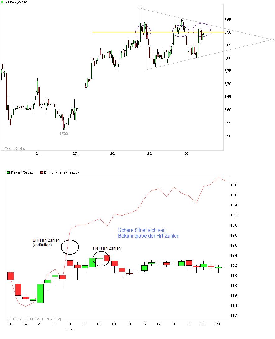 zu an der 8,90. Heute in der Frühe durchgesackt bis 8,80 und jetzt wieder mühsam hochgekämpft nahe an die 8,90. Mal schauen, ob man auch heute wieder auf SK darüber kommt. Ist halt eine ziemlich festgefahrene Kiste aktuell an den Märkten. Alles wartet auf die Ergebnisse von Jackson Hole und niemand will vorher nochmal richtig Geld in die Hand nehmen. Von daher ist es schonmal erfreulich, daß man in so einem "toten" Umfeld die letzten Tage bei DRI bis an die 8,90 gekommen ist. FNT z.B. scheint eher in einen sommerlichen Winterschlaf gefallen zu sein, seit den nicht so knalligen Hj.1 Zahlen. Die Tagesschwankungen dort konnte man zuletzt eher mit der Lupe beobachten und die Schere seit Bekanntgabe der Hj.1 Zahlen von DRI und FNT zeigt, daß man DRI wohl wirtschaftlich mehr zutraut als FNT. DRI hat (anders als FNT) wenigstens noch Wachstum beim Postpaid-Bestand verkünden können.