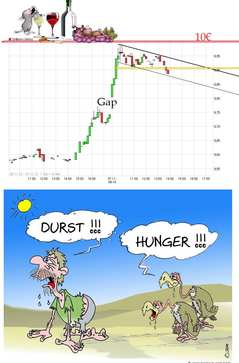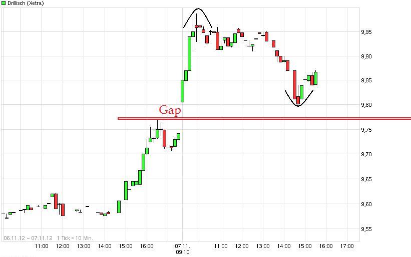 Für mich ist nicht so wichtig, ob man das Gap nun noch wirklich zumacht oder nicht. Wichtiger wäre, daß man endlich klar und nachhaltig über die Region 9,80/10€ kommt. Wer sich etwas mal mit dem Big Picture beschäftigt erkennt, daß wir hier an einer sehr wichtigen Chartregion angekommen sind. Wenn es gelänge dort hinüberzukommen, dann würde das Kursfenster sich wieder ein ganzes Stück nach oben öffnen. Somit ist es mir doch 100 mal lieber man würde endlich klar und nachhaltig über die 10€ laufen anstatt unbedingt ein Gap zu schließen. Wie gesagt: ein Breakaway Gap wäre etwas positives laut Defintion. Also Daumen drücken die Zahlen von DRI toppen nochmal das was FNT gebracht hat. Wobei mich die FNT Zahlen jetzt auch nicht so vom Hocker gehauen haben. Aber zumindest hat FNT wieder etwas Fahrt aufgenommen bei der Steigerung der Vertragskundenzahl. Da war ja noch im 2.Q völliger Stillstand. Bin mal gespannt wie bei DRI das Wachstum in dem Bereich in Q.3 gegenüber Q.2 war.