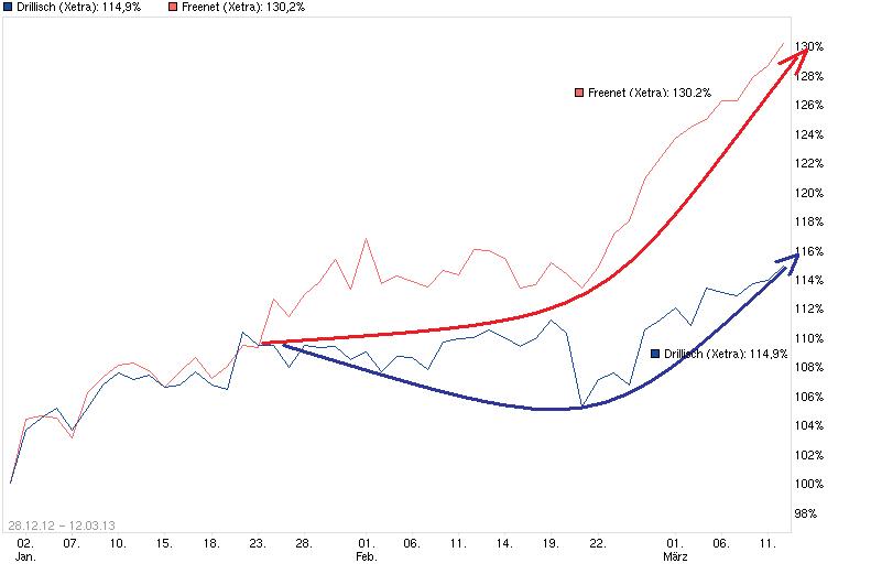 Für die Bewertung der Drillischaktie ist zudem wichtig, dass stille Reserven in der Freenet-Beteiligung schlummern, die weit über EUR 100 Mio liegen. Auch die Bedingungen der begebenen Umtauschanleihe sind - wenn man mal Langeweile hat - interessant und durchaus bewertungsrelevant... da u.a. Freenet-Dividenden mit den Anleihegläubigern zu teilen sind.