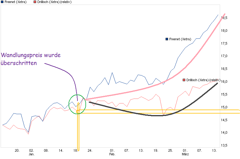 Sehe es ähnlich. Solange der Ausbruch aus der Seitwärtsrange bei roundabout 12,45/50 weiter nachhaltig erhalten bleibt, besteht erstmal weiteres Aufwärtspotenzial. Flossbach wäre sicherlich einer der gut denkbaren Kandidaten die im Eismeer ihr Unwesen treiben. Immerhin hat Flossbach die Unterscheitung der 5% vor nicht langer Zeit gemeldet und man dürfte kaum angefangen haben zu reduzieren um genau knapp unter 5% wieder aufzuhören. Wie sieht es eigentlich mit der Wandelanleihe im Detail aus? Normalerweise kann doch der Gläubiger am Ende wählen, ob er die Summe in Aktien zu einem bestimmten Cap erhält oder ob er die Kohle als Cash zurückbekommt. Das ist ja der Reiz für den Gläubiger und daher verlangt er ja auch nur einen unterdurchschnittlichen Zins, weil er hofft später Aktien günstiger zu bekommen als der Marktpreis dann ist. Der Wandlungspreis der für 125 Mio. gekauften FNT Aktien liegt ja soweit ich mich erinnere bei ca. 14,77 (Stand Mitte 2012). Seit Mitte Januar ist man jetzt aber bei Freenet über die Wandlungspreis gelaufen. Genau seit dieser Zeit fängt jetzt FNT an sich immer weiter von DRI abzukoppeln. Gibt es da einen Zusammenhang? Sehe ich das richtig, daß Drillisch jetzt nicht mehr bei diesen durch die Wandelanleihe finazierten FNT-Aktien mitpartizipiert, wenn der Kurs weiter über den Wandlungspreis hinausgeht, da dies den Gläubigern später zugute kommen wird? Nach drei Jahren können ja sowohl Drillisch als auch die Gläubiger vorzeitig die Anleihe auflösen, wenn bestimmte Kursmarken bei FNT erreicht wurden. Die wurden jetzt bereit schon ereicht. Und wenn FNT so weitermacht, dann sollte man auch so schnell nicht wieder darunterfallen. Würde bedeuten im Frühjahr 2015 wäre eine vorzeitige Wandlung seitens der Gläubiger sehr wahrscheinlich, oder? Würde das dann nicht den Einfluß von Drillisch auf FNT wieder deutlich mindern, falls nicht DRI wieder im gleichen Maße dann zukauft?