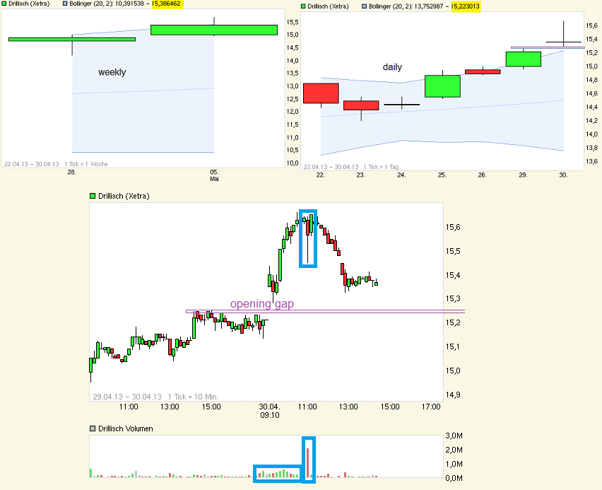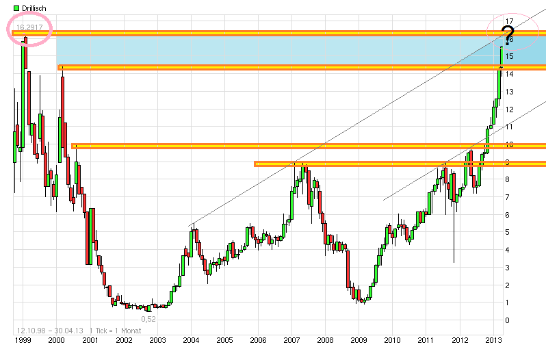 Netter Spurt nachdem man die seitliche Schaukelrange der letzten Wochen nun verlassen hat. Die jüngste Trommlei gewisser Börsenbriefchen und Musterdepotbetreiber zeigt scheinbar auch eine gewisse Wirkung bei der Gefolgschaft und unterstützt den Schub mit. Hoffen wir mal die jüngsten Verkäufe der Vorstände stehen nicht im zeitlichen Zusammenhang mit den kommenden Q.1 Zahlen, sondern hatten andere Gründe. Sollten die Q.1 Zahlen und Prognosen gut ausfallen und positve Neuigkeiten beinhalten, dann wäre vielleicht sogar noch denkbar bis zur HV die Region bei roundabout 16,30 anzulaufen. Da wäre aus meiner Sicht wohl der nächsthöhere horizontale Widerstand erstmal. Wenn man dann bei der HV ca. da stünde und es exDiv und den Wochen danach nochmal Richtung 14,30/50 gehen würde, dann könnte man da vielleicht nochmal kaufen mit dem Ziel wieder Kurs aufzunehmen Richtung 17€. So kämen dann auch die Fibo und Retracementfreude auf ihre Kosten, denn 14,30 ist ca. die 100% Ausdehung seit dem Low im Juli 2012 (7,14€ am 12.7.12 auf Xetra) und 17€ wäre ca. die 138,2% Ausdehung seit dem Low im Juli 2012. Sollte es wider meiner Erwartung vor der HV direkt auf 17€ gehen, dann könnte ich mich zur Not auch damit anfreunden :) Aber erstmal abwarten was die Zahlen und die HV an Neuigkeiten bringen werden. Schließlich gilt es erstmal wie beim Fußball den Kasten hinten dicht zu halten und dann vorne die Dinger reinzuknipsen. Nach dem Kursanstieg des letzten 3/4 Jahres um deutlich über 100% darf man sich keine Wackler erlauben bei den Zahlen, da die Erwartungen doch inzwischen nicht mehr gerade gering sind.