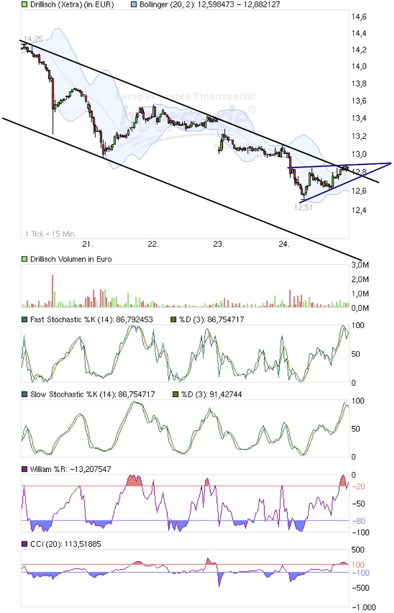 - Dann habe ich mir grob den Chart angesehen und gedacht: hier haben wir den bearishen Keil, aus dem es eigentlich nur nach unten gehen kann, den Widerstand 12.95/13,- und dann noch die obere Begrenzung des Trendkanals, an dem wir oben anstoßen - also zusammen mit den kurzfristigen Indikatoren und dem Weekly eindeutig ein Shortsignal!