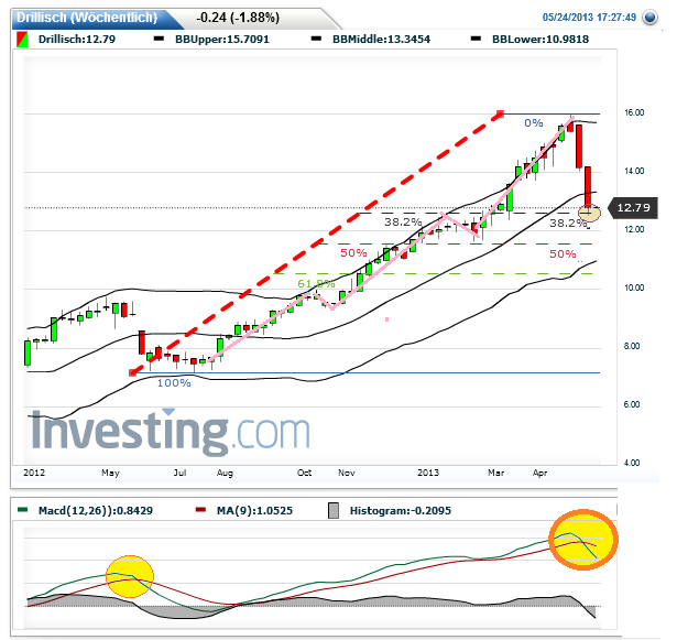Der Wochenchart zeigt, dass die derzeit laufende scharfe Korrektur bei 12.50 mit Sicherheit ihren Tiefpunkt noch nicht erreicht hat, da sie so schnell erfolgte und von wesentlichen höheren Umsätzen getragen ist als die Korrektur vor einem Jahr. 11.40 als nächste größere Unterstützung ist damit als Kursziel sehr wahrscheinlich, möglich ist sogar eine Korrektur bis 10.-. Eine Trendumkehrformation ist nicht ersichtlich.