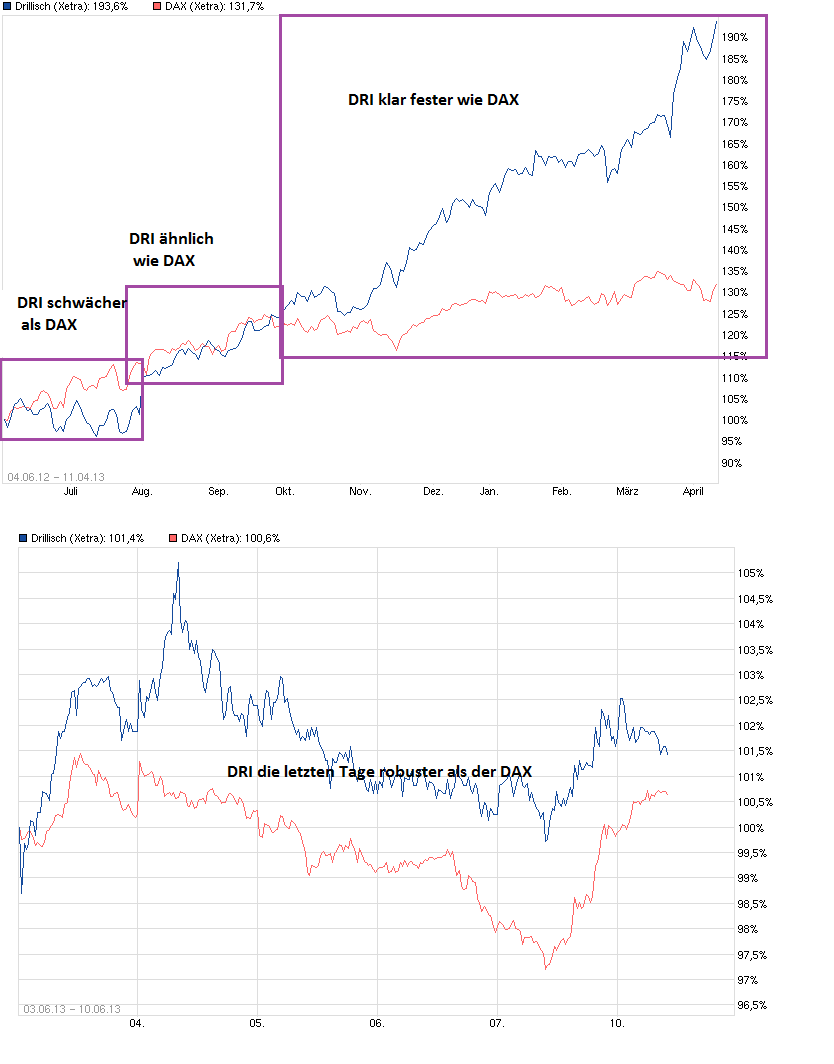 Aha, das kannst du alles aus dem heutigen Tag nun für das ganze restliche Jahr damit rauslesen? Huiiiii....!! Was soll das denn für eine sinnleere Aussage sein in dem Posting? Wenn der DAX nicht über 9000 steigt, dann wird es für Drillisch nicht gut ausgehen und man immer weiter ins Minus driften, oder was sollte das jetzt sagen? Aber, hey, vielleicht steigt der DAX auch lediglich heute etwas mehr, weil er die letzten Tage schwächer war relativ zum DRI betrachtete.  Und zudem läuft DRI nicht immer stur nach DAX. Schau dir mal das 2. Hj.2012 an.
