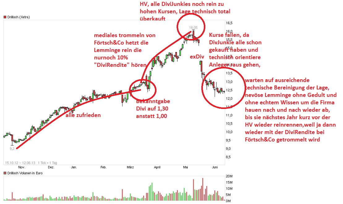 ist wie ich schonmal geschrieben habe vermutlich dem Einstiegszeitpunkt geschuldet wie nervös macher Anleger jetzt auf die Rücksetzer der letzten Wochen reagieren. Vor ein paar Monaten haben die Jungs die schon länger investiert waren in einem ruhigen Thread-Umfeld noch darauf erfreut angestoßen, daß als die runden Marke 10, 11 oder gar 12 genommen wurden und waren zufrieden über die großen Zugewinne seit letzten Sommer. Von 17 oder mehr hat da keiner groß gesprochen. Jetzt steht man weiterhin über 12€, man hat zudem jüngst noch 1,30 Cash bekommen pro Aktie. Und nun jammern hier manche Leute plötzlich rum die Aktie wäre nicht gut. Vielleicht ist aber die Aktie nicht schuld, sondern nur der unvorteilhafte Einstiegszeitpunkt und übertriebene Kurzeiterwartungen. Dann sollte man sich vielleicht keine Aktie kaufen mit hoher DiviRendite, wenn einen der dann folgende hohe DiviAbschlag und eine völlig normale Konsolidierung im Anschluß wuschig macht. Bis zur DiviAnhebung auf 1,30 war man hier doch friedlich und happy. Mit 1€ Divi wäre man mehr als zufrieden gewesen. Dann wurde nach der Bekanntgabe der DiviAnhebung in allen Börsengroschenheftchen und Lemmingscheucherportalen so getan als ob wg. der 1,30 Divi nun die nächten Verdopplung vor der Tür stünde und immer mit dieser lächerlichen DiviRendite argumentiert. Wirklich in die Tiefe gegangen ist da doch keine dieser Pseudo-"Analysen" von den ehemaligen Gebrauchtwagenverkäufern die da auf die Trommel hauten. Da hat keiner mehr unterschieden zwischen operativ erwirtschafteten Erträgen und einmaligen Sondererträgen. Da haben halt dann viele Kleingeldkäufer blind zugegrifffen in einer technisch schon extrem überkauften Chartlage (obwohl z.B. in diesem Thread x-mal darauf hingewiesen wurde) und offenbar geglaubt der Kurs würde trotz hoher Divi keinen hohen Abschlag bekommen und stattdessen auf 17, 19 oder mehr weitersteigen wg. der "DiviRendite". Die Divi ist für mich bei keiner Aktie ein wichtiges Kaufkriterium. Ausschütten kann man wie man lustig ist, daß alleine sagt noch nichts über die Ertragseite aus und wie diese künftig wachsen wird. Die DiviSteigerung von 1€ auf 1,30 ist ja alleine den einmaligen Sondererträgen geschuldet die aus dem FNT Teilverkauf entstanden. Somit ist die eigentliche Divi wohl "nur" 1€ und die weiteren 30 Cent eine versteckte bzw. gestaffelte Sonderdivi, die nicht wie üblich auch einmalig ausgezahlt wird, sondern "getarnt" über 3 Jahre. Wichtig ist nicht was ausgeschüttet wird, sondern was künftig verdient wird. Und da die erfreuliche EBITDA Prognose für die kommenden beiden Jahre jüngst nochmal vom Management bestätigt wurde, dürfte es augenblicklich nach Plan weiter laufen. Und das bedeutet auch, daß aus fundamentaler Sicht weiter alles o.K. ist und aktuell lediglich eine technische Konsolidierung läuft, wie sie z.B. im letzten Jahre nach der HV auch lief. Ich denke wenn DRI bis zur nächsten HV wieder da stehen würde wo man kurz vor der jüngsten HV stand, dann könnte man zufrieden sein. Ich erwarte auf dem momentanen Kursniveau keine Monsteranstiege nach oben. Dafür habe ich aber eine Aktie die ein bewährtes Management und einen soliden Cashflow hat und nicht übermäßig konjunktursensitiv reagiert. Von daher ist in einem Markt der nicht kollabiert wie 2003 oder 2009 nach unten das Risiko vom aktuellen Kursniveau her eher überschaubar. Ob man vielleicht nochmal in Richtung 11,50/70 gehen wird oder nicht, muß man mal abwarten. Hängt auch damit zusammen, ob der Gesamtmarkt sich eine Sommerpause gönnt oder ob man da nochmal deutlich Gas geben wird die kommenden Monate. Von daher wäre mein Rat gelassen zu bleiben, Abstauber unter 12 reinstellen, untere BB im Weekly beobachten und dann mal sehen was die Hj.1 Zahlen und Prognosen dann wieder bringen werden.