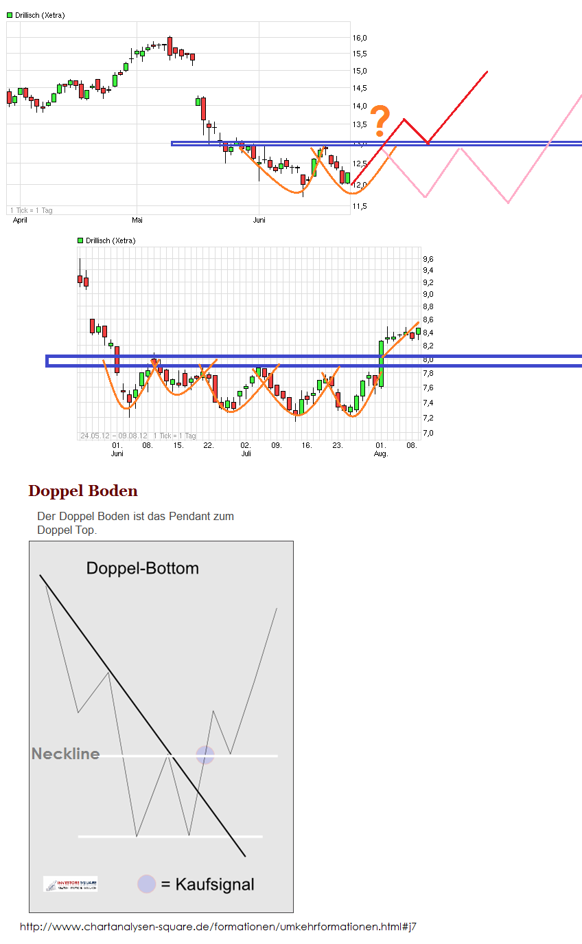 Wenn du einen Doppeltief bzw -boden willst, dann wäre dir mit 12,40 nicht ausreichend geholfen. Da wären noch mindestens 60 Cent mehr nötig. Doppelboden bei 12€ ist also noch nicht verkündbar, sondern erstmal nur ein Hoffnungsruf. Bei einem Doppelboden ist die Oberseite genauso wichtig. Zweimal lediglich unten irgendwo gewesen zu sein sagt erstmal isoliert noch garnichts. Defintiongemäß haben wir bislang also noch keinen Doppelboden, sondern laufen in einer Korrekturflagge ohne zu wissen wieviele Seitwärts-V-Wellen vielleicht noch kommen. Man kann lediglich hoffen es könnte sich ein Doppelboden in der kommenden Zeit noch ausbilden. Ein Doppleboden läge erst vor, wenn es gelänge nachhaltig jetzt über 13,00/10 zu laufen, d.h über diese potenzielle Nackenlinie. Im letzten Sommer hat man auch eine ausgedehnte Seitwärtsphase gehabt, wo auch einige Leute zu früh schon "Doppelboden" ausriefen. Von daher muß man abwarten wie die Formation sich wirklich weiter entwickelt und ab wann man dann die 13 wieder nachhaltig von oben sieht. Prinzipiell wäre ich aber für steigende Kurse bei DRI immer zu haben ;) Nur das klare größere Kaufsignal ist aus meiner Sicht bislang noch nicht wieder ausgelöst worden.