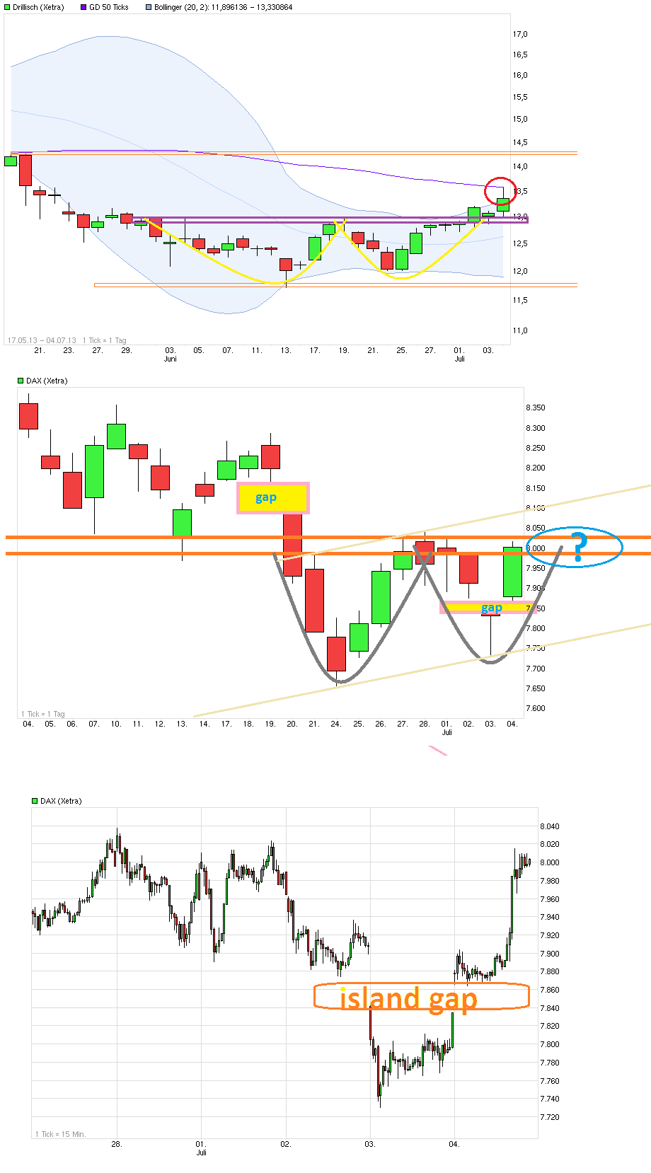 Stimmt. Aber (erstmal) nur kurz. Der von "Der Aktionär" aufgescheuchte Hühnerhaufen war so nett den Leuten die an der 50er verkaufen wollten die Stücke dort abzunehmen. Ohne Grund mag es Chart für gewöhnlich auch nicht unnötig weit aus dem Bollinger Band rauszulaufen. Auch daher wenig überraschend, daß man nach dem 50er-Anklopfer wieder zurücklief. Der Gesamtmarkt war heute ohne Amis fest. Wäre die Frage, ob auch der DAX nun ein zweites Standbein ausgebildet hat und ähnlich wie Drillisch eine W-Formation abschließen kann. Noch ist es jedenfalls nicht geschehen. Morgen kommen um 14:30 wieder die monatlichen NFP, was indirekt auf die Erwartungen an die weitere FED Politik ausstrahlt. Die ADP Zahlen am Mittwoch waren ja schon klar über der Prognose. Wäre also nicht unwahrscheinlich die NFP werden es auch sein. Wie reagiert die US- Börse und damit auch der europäische Dackel auf gute Arbeitsmarktzahlen. Freut man sich, weil es ein Signal wäre die US-Konjuktur fast weiter Tritt oder füchtet man QE3 wird schneller/eher enden als erhofft? Schwer abzuschätzen. Ein weiter anziehender Gesamtmarkt wäre für Drillisch nicht unvorteilhaft. Warten wir es mal ab. Solange man nicht wieder nachhaltig unter 12,90 läuft bei DRI bleibt alles im Lot. Im Moment sieht es im DAX Chart der letzten 3 Tage nach einem Island Gap aus. Würde es so offengelassen, dann wäre es ein positives Signal ( => GAP (Kurslücke) - Island Gap : Island-Gaps sind Umkehrformationen. Nach dem ersten Gap folgt im Normalfall eine kurze Seitwärtsphase, im fortlaufenden Handel wird dann das zweite Gap fast parallel zum anschließend ersten Gap geschlossen. Bildlich gesprochen schweben diese Kurslücken (Gaps) förmlich über den jeweiligen Kursen, wie Inseln, daher der Name. Je nach Marktrichtung Long oder Short können diese Gaps als Handelssignal herangezogen werden.Erfahrungsgemäß sind diese Gaps relativ aussagekräftig und haben eine hohe Prognosequalität . www.broker-test.de/finanzwissen/.../gap-kursluecke-island-gap/ )