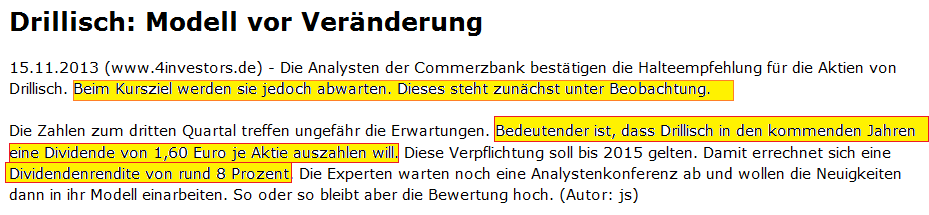 Unser "geliebte" ;) CoBa mal wieder. Außer der gestern von mir erwähnten "Blendgranate" ist den Leuten wohl auch nichts aufgefallen bei den Zahlen. Wird nur rund um die Divi rumgeschwurbelt, aber nichtmals darauf eingegangen wie sie sich zusammensetzt (operativ + nicht operativ). Dinge wie die Marge etc. werden nicht erwähnt. Vermutlich kennt das Analysten-Prekariat der CoBa auch nichts außer Divi. Scheint als würden da die gleichen Clowns beschäftigt wie bei den Kulmbachern ;) Man kann sich dort natürlich wieder nicht zu einem "buy" durchringen. Heike Pauls hat mit ihren exotisch-niedrigen KZ die letzten Jahre sämtliche Anstiege bei Drillisch verpennt oder die Story bis heute noch nicht kapiert. Von daher mal schauen, ob sie jetzt vielleicht mutig ihr KZ auf 13,60 erhöht. Bis jetzt war sie weiter mit 13,50 als KZ dabei. Vielleicht ist diese totale Unfähigkeit von Heike Pauls nun auch bei der CoBa so langsam den Vorgesetzen aufgefallen und man hat die Dame unter "Beobachtung". Ihre Beschäftigung ist vielleicht auf "hold" gesetzt, aber bei noch einer weiteren Fehleinschätzung gegenüber DRI muß man dann leider "sell" zu Heike Pauls sagen bei der CoBa, da es dann doch zu auffällig wird, daß die Dame nur Minderleistung abliefert.