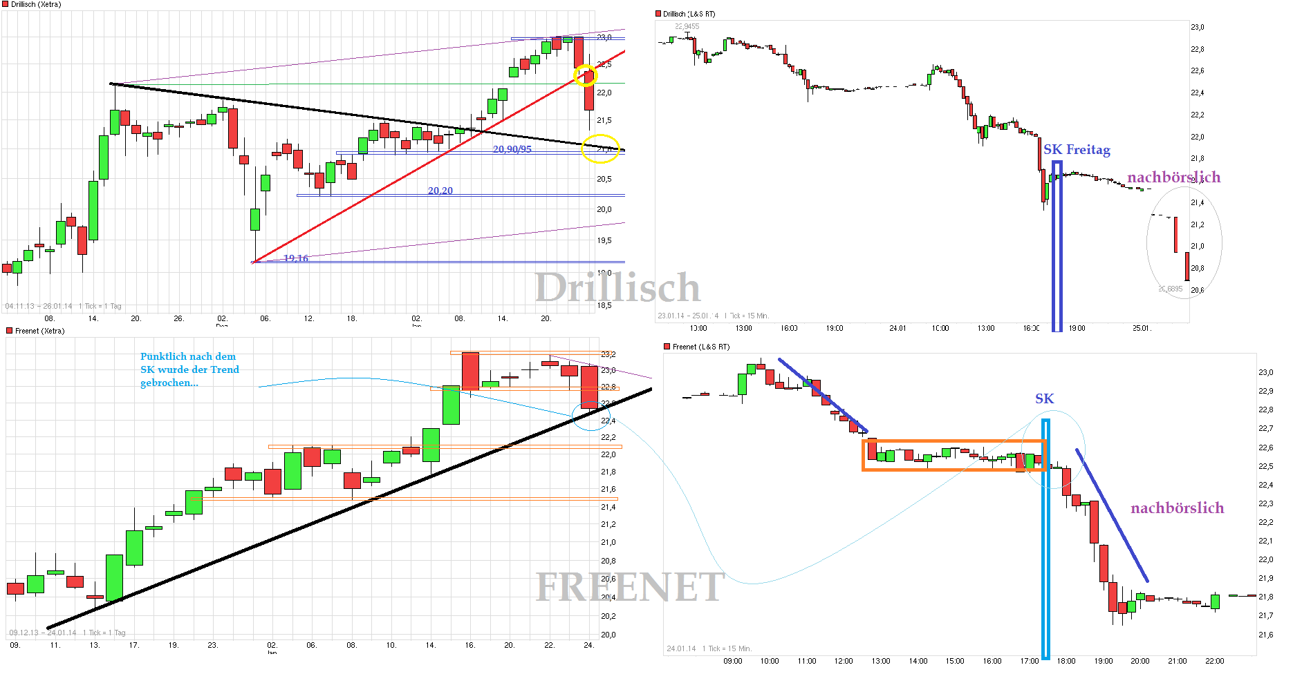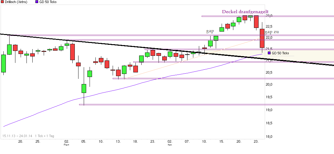 Also bei L&S gab es heute ja eine Rabatt-Aktion für DRI-Aktien. Wer hat denn für 20,65 verkauft? Ist schon klar, daß bei LuS am WE eher kleine Stückzahlen gehandelt werden und auch die Spreads hier deutlich höher sind als während des normalen Handels und somit bei unlimierten Verkäufen entsprechend deutliche Abschläge außerbörslich zu sehen sind. Aber wenn man am Montag auf Xetra auch unter die Region 20,90/95 geht, dann könnten da vermutlich einige SL nochmal fliegen, da dann die Lows von Ende Dez./Anfang Jan. rausgenommen würden. Man hat ja Anfang Dez.13 gesehen wie fix DRI auch mal knapp 3€ zurückkommen kann ohne selber eine verursachende News rauszugeben. Man kommt jetzt von 23€. Ich bin jetzt doch mal geizig und stelle meine verbliebene Buy-Limit Order um von 21,00 auf 20,25. Wenn ich nicht bedient würde wäre es auch nicht so schimm, da ich bei 21,40 schon einige Shares nachgekauft hatte. Die Goldmänner haben ja jüngst verkündet sie hätten einen 10% Rückgang der Indizes auf dem Radar ( http://www.cnbc.com/id/101331228 Monday, 13 Jan 2014 Lofty market ripe for at least 10% drop: Goldman Sachs ). Und Opa Bernecker spielt das Echo und singt jüngst das Lied gleich hinterher ( => http://www.youtube.com/watch?v=KMBpt9RVh0w ). DAX hat schon 5% südwärts hingelegt die letzten Tage. Mal schauen, ob die Glaskugel von GS was taugt oder ob der Markt sich mit weniger zufrieden geben wird. Da dürften die Aussagen der FED am Mittwoch sicher nochmal ein zusätzlicher Katalysator werden für die ein oder andere Richtung. Sollte der DAX wirklich nochmal Richtung 9000/9200 gehen, dann könnte DRI unter Druck bleiben. Daher würde ich keinem empfehlen jetzt zu heiße Long KO Zertis zu kaufen. Ich werde jedenfalls im Moment nur dosiert etwas zukaufen und zwar bei Werten die fundamental den Preis rechtfertigen. Gabe aber speziell bei Small Caps und im TecDax noch genug Werte die selbst bei einem 10% Rücksetzer noch immer krass überwertet wären. Viele Anstiege erfolgten dort durch gescheuchte und nicht besonders börsenerfahrene Kleinanleger die garnicht wirklich wissen was sie kaufen und was die Aktien fundamental wert sind. Gerade diese Käufergruppe der Quereinsteiger spült es ja zunehmend in den Markt mangels der "Alternativlosigkeit" bei Spareinlagen. Die Börsengroschenheftchen am Bahnhofkiosk laufen wie man hört wieder gut und gerade in diesen Publikationen werden übermäßig kleineren deutschen Werte stark hervorgehoben (da sich so besser scalpen läßt ;) ). Die Klientel rennt dann rein, weil Kulmbach oder andere Lemmmingscheucher dafür trommeln oder irgendwelche Musterdepotaufnahmen erfolgen. Und natürlich folgen die Leute kollektiv dann auch den dort gesetzen SL Marken/Depotentnahmen. Die Fischer-Innung freut es. Zudem kaufen sehr viele Trader nur aus rein charttechnischen Überlegungen. Sobald die kurzfristigeren Trends oder Unterstützungsmarken aber brechen, wird dann einfach stur verkauft. Das erzeugt dann gerade bei kleineren Werten noch schnellere Einbrüche an Tagen wo das Börsensentiment eh schon trübe ist. Bleibt die Frage, ob für den Fall die laufende Gesamtmarkt-Korrektur ginge noch einige Zeit weiter südwärts, man wie die letzten Tage mit der Rasenmähermethode weiter verfahren wird und alle Werte mehr oder weniger ähnlich verprügelt oder ob dann langsam doch wieder etwas differenzierter geworfen wird und speziell instit. Anleger wieder selektiver vorgehen und die Gunst der Stunde nutzen bevor die frisch gepamperten Kleinanleger wieder aus dem Panic Room kommen. Übrigens interessant auch zu sehen wie auch FNT kursmäßig kurzfristig lief. Die haben am Freitagnachmittag bis zum Xetra-SK um die 22,50 relativ stabil rumgelutscht und erstmal den DRI Absacker gegen 16:00 so nicht mitgemacht. Kurz nach dem SK ging es dann aber auch bei FNT grundlos pötzlich unter die 22,50, d.h. die Grenze wo der Aufw.trend der letzten Zeit verlief. Dürften also auch da am Montag wohl erstmal die Trendfolger gekickt werden zur Eröffnung. Tja, man läßt die beiden Kurse wohl einfach nicht länger als für ein paar Stunden weiter auseinander stehen.