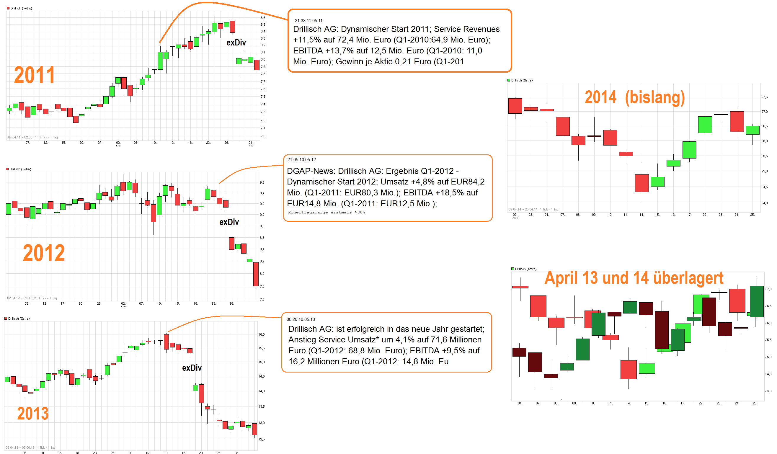 Nur bedingt. Und auch anders wie z.B. vorletztes Jahr. Wenn man mal nicht nur isoliert 2013 betrachtet, sondern z.B. auch den gleichen Zeitraum 2012 und 2011 betrachten, dann sieht man doch gewisse Eigenheiten die so nur in den jeweiligen Jahren vorkamen. Könnte daher gut sein auch in diesem Jahr wird sich Drillisch noch ein neues Muster suchen für die letzten Wochen vor der HV. Während z.B. die letzten beiden Jahre der Kurs nicht mehr nennenswert auf die Q.1 Zahlen (die ja stets noch kurz vor der HV kommen) reagierte bzw. sogar leicht negativ an den Tagen darauf, so hat man z.B. in 2011 noch sehr positiv anschließend darauf reagiert an den Folgetagen. Somit muß man auch mal schauen wie in diesem Jahr die Q.1 Zahlen noch ankommen werden (offizieller Termin 14. Mai, aber vielleicht kommen die vorläufigen Zahlen wieder eher). In 2012 ist man im April/Mai eher seitwärts geschwommen ohne echte DiviRalley, während 2011 und 2013 der Kurs in den Wochen vor der HV doch noch etwas anzogen. Ein Blick auf die Realität der letzten Jahre zeigt also, daß es nicht zwangsläufig in jedem Jahr diese DiviRalley gibt in den letzten Wochen vor der HV. Daher im Augenblick auch nicht wirklich absehbar, ob man sich 2014 mehr an 2012 oder 2011/13 orientieren wird (oder etwas ganz anderes machen wird?). Natürlich wünscht sich jeder der Investierten es kommt noch zu einem weiteren Run vor der HV. Aber man sollte nicht unzufrieden sein, falls es nicht dazu käme, zumal der Gesamtmarkt auch momentan etwas orientierlos wirkt und sich nicht wirklich entscheiden kann, ob er nochmal deutlich abgeben will oder doch neue Hochs machen. Angesichts der extrem hohen Anstiege bei DRI in den letzten Jahren dürfte es für die bereits etwas längerinvestierten Leute eh wenig von Bedeutung sein, ob man jetzt vor der HV noch ein paar Cent mehr oder weniger hochgeht oder nicht. Mittelfristig ist das Bild ja weiter intakt und darauf kommt es ja in erster Linie an. Interessant ist es vielleicht eher für Leute die überlegen kurz vor der HV ihre Posi abzubauen, um später nach einer größeren exDiv Konso klar günstiger wieder einzusteigen als nur um den Divi Abschlag. Je höher der Kurs steht bzw. je heißer der Wert noch laufen sollte vor der HV, desto interessanter könnte diese Tradingidee sein. Sollte DRI jedoch vor der HV nahe an der SMA50 oder sogar tiefer rumeiern, dann wäre mir das aber z.B. nicht mehr interessant genug, um sowas zu machen. Zumindest kann man aber wohl sagen, daß es - mit Blick auf die letzten Jahre - eine erhöhte Wahrscheinlichkeit gibt, daß je näher die HV rückt eine größere Konso in der Phase ausbleibt (falls nicht der Gesamtmarkt in der Zeit extreme Tauchgänge vornimmt). Aber Wahrscheinlichkeit ist nicht gleich Sicherheit. Daher gibt es natürlich immer ein Restrisko. Wer jetzt also erst jetzt einsteigt, der sollte nicht meinen DRI wäre ein Free Lunch, wo man bis zur HV nicht mehr fallen kann und im Idealfall stetig steigen wird.