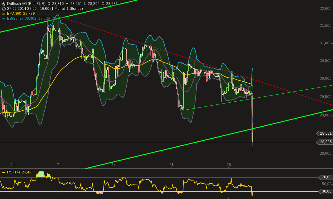 Am Ende kommt es eben doch anders als man denkt... Dass es eine heftigere Kursbewegung geben wird, war relativ vorhersehbar (siehe Chart). Das Dreieck schloss sich, ebenfalls der Bollinger-Flaschenhals. Ich habe nur nicht erwartet, dass das Bild nach unten aufgelöst wird... Dass es sich um eine Übertreibung handeln sollte, sollte an dem kurzfristigen Unterschreiten des langfristigen Aufwärtstrends deutlich werden (Achtung: Stundenkerzen!), und dies ohne irgendwelche News - das ist absurd. Na gut, hab ich eben auch nochmal nachgekauft