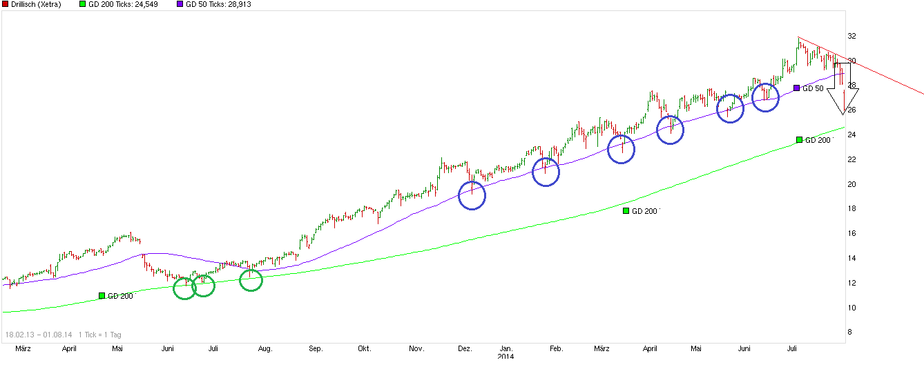 Kann natürlich überall hinlaufen. Die letzten Jahre war es eigentlich immer so, daß wenn die SMA50 klar aufgegeben wurde, danach die SMA200 als Auffangboden diente. Werde mal eine Abgreiforder in der Nähe dieser Region platzieren. Bin eh nurnoch mit 10% vom ehmaligen DRI-Bestand dabei, da Kurse jenseits der 30 für mich dann doch zu "sportlich" erschienen und Kasse machen reizvoller aussah. Ich will jetzt erstmal die Hj1 Zahlen und die weiteren Prognosen sehen, speziell unter Einbeziehung einen Kaufs der E+/O2 Kapazitäten. Da stand nämlich nicht die Bohne in der Adhoc vom 25.6. welche Kosten und neue Risiken damit künftig verbunden sind und wie man die nötigen Kunden bekommt, um diese riesige Kapazitätsmenge auszulasten. Bekommt man ja wohl nicht von E+/O2 dazu geschenkt.