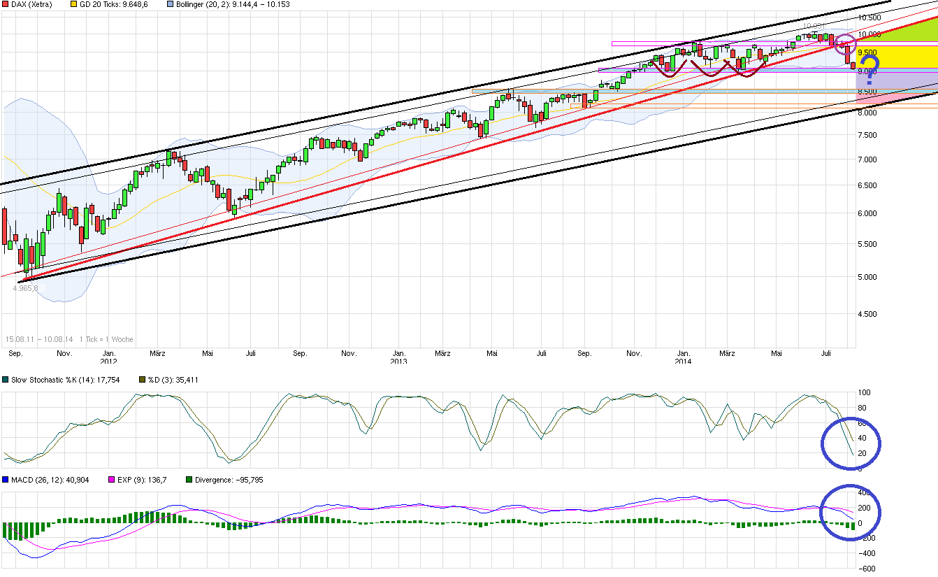 http://www.brn-ag.de/...t-Boersenampel-auf-ROT--DAX-mit-8000-moeglich ). Sollte man Richtung 8500 noch maschieren (oder im Extremfall bis zu den alten ATH um 8150), dann hätte DRI wohl noch nicht den Boden erreicht. Warten wir mal ab was die Bullen noch machen. Noch schaffen es die Bullen aktuell die 8900 zu verteidigen, um die große Seitwärtsrange (8900/9000-9950/10050) nicht aufzugeben. Wie lange noch ist offen. Viele Leute sind ja jetzt im Urlaub, d.h. aus der einen Seite sind ist die Nachfrage ausgedünnt, auf der anderen Seite haben viele ihr Depot "urlaubsfest" gemacht, d.h. viele Depotwerte mit SL versehen. Sollte also mal so eine "massentaugliche" Marke fallen, dann kann es schonmal nachrichtenlos recht rückartig und schnell nach unten gehen, speziell bei den kleineren Werten bzw. Nebenwerten, wo doch der Anteil von Privatanlegern recht hoch ist und viele der Kleinanleger garnicht wirklich viel wissen über ihre Aktien im Depot, sondern meist nur gekauft haben weil Kulmbach und andere Helden sie reingetrommelt hatten, incl. vorgekauter SL Marken. Ein Eldorado für Hedgies mit ihren Leerverkäufen. August und September sind bekannt für ihre Anfälligkeit für Korrekturen. Wir haben noch nichtmals Mitte August. Von daher wohl besser nicht jetzt zuviel Cash-Munition schon verballern, da es durchaus nochmal günstiger werden könnte. Ich habe heute zumindest schon wieder leicht zugekauft bei DRI nach längere Zeit ( zu 23,80€ ). Ich hatte ja sehr große Teile meiner Posi abgebaut durch stetige Teilverkäufe im Bereich 28/31. Aber bei der 50er im weekly dachte ich es könne sich jetzt doch eventuell anbieten schon wieder etwas zu "naschen" ( =>