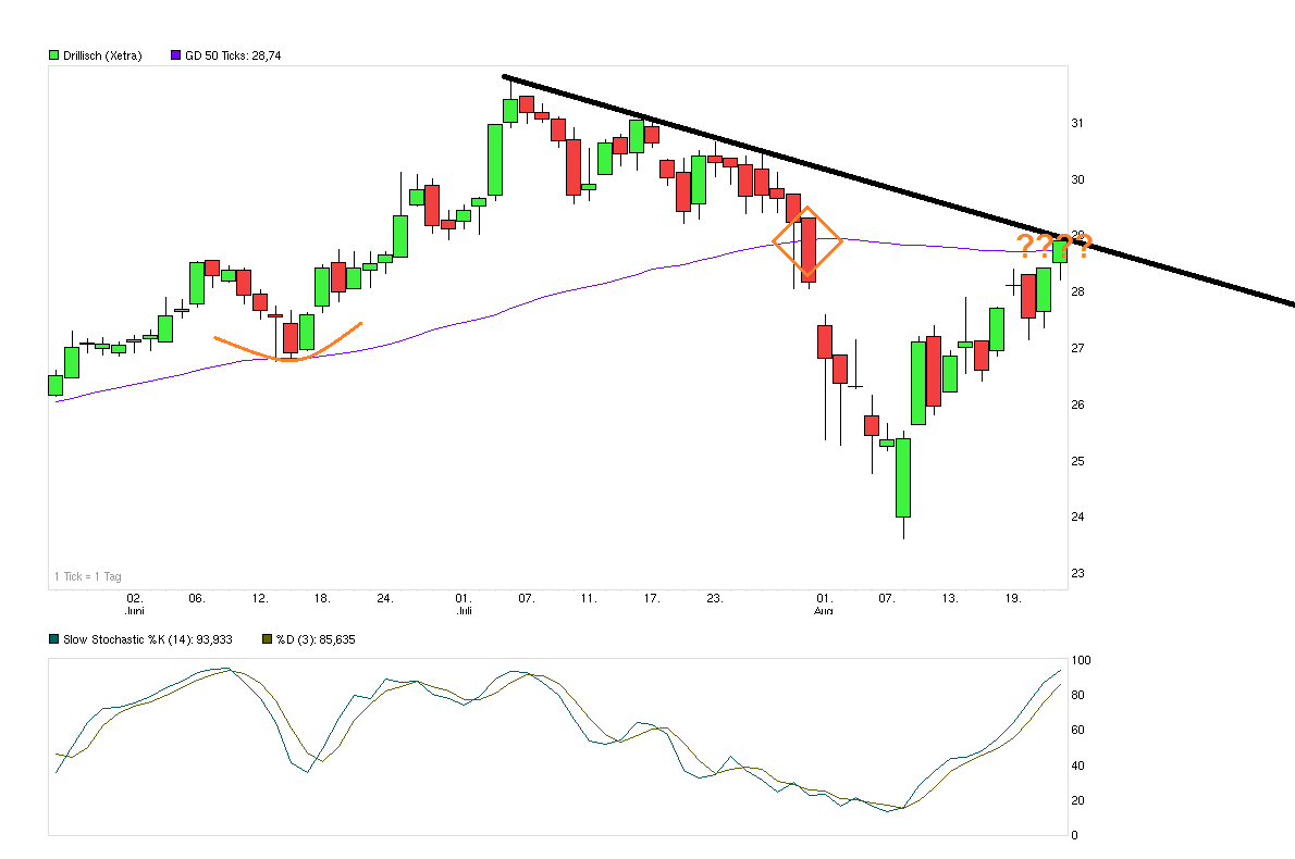 Nachricht vom 22.08.2014 22.08.2014 (www.4investors.de) - Die Drillisch-Aktie hat als Reaktion auf die vorangegangene Hausse im Juli bei 31,76 Euro eine harte Konsolidierungsbewegung begonnen, die mittlerweile aber ad acta gelegt sein dürfte – zumindest zunächst. In den vergangenen Tagen hat sich das TecDAX-notierte Telekommunikationspapier deutlich positiv entwickelt und konnte von 23,61 Euro auf bis zu 28,40 Euro klettern. Das Verlaufshoch wurde gestern erreicht, es war zugleich Tageshoch und Schlusskurs für die Drillisch-Aktie im XETRA-Handel am Donnerstag. Die vorbörslichen Indikationen am Freitagmorgen drehen sich um diese Marke, liegen aktuell um 28,34/28,55 Euro.