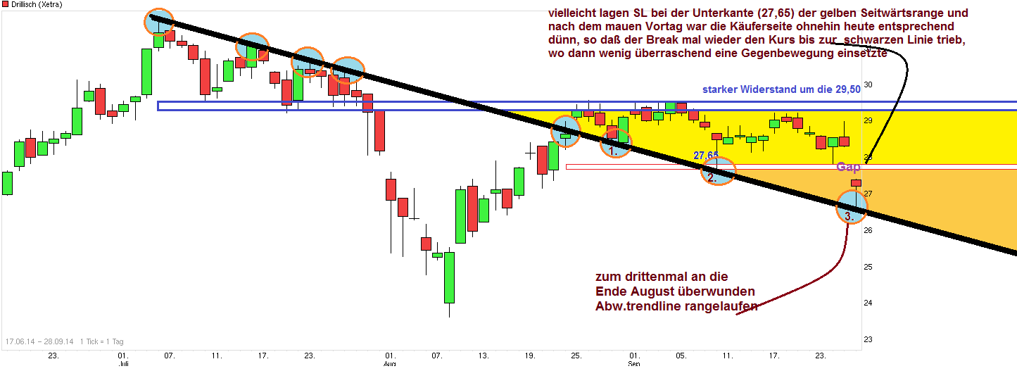 also wenn der DAX innerhalb weniger Handelsstunden von gestern Nachmittag bis heute früh um ca. 250 Punkte fällt und der SK im DAX klar unter der 200 Tagelinie war, dann braucht keiner glauben Drillisch lebt mit seiner ohnehin sehr sportlichen Bewertung im rosaroten Wolkenkuckucksheim und bleibt brav weiter oben als wäre nicht um den Wert herum los. Man hat ja schon in der ersten Augusthälfte gesehen, daß der Wert bei Gesamtmarktschwäche auch mitfällt. Schätze mal, daß hier die Marke um die 27,65 jetzt etwas den Ruck zu Handelsbeginn mitausgelöst hat, weil bestimmt doch viele Leute bei der SL Platzierung sich an der Unterkante der Seitwärtsrange der letzten Wochen orientierten. Wenn man halt die 29,5 nicht nach oben rausnehmen kann, dann muß man halt immer wieder ausloten was auf der Unterseite noch geht. Und da scheint die Ende August überwundene schwarze Abw.trendlinie gewisse magnetische Eigenschaftem zu besitzen. War jetzt schon der 3. Rücklauf an diese Linie.