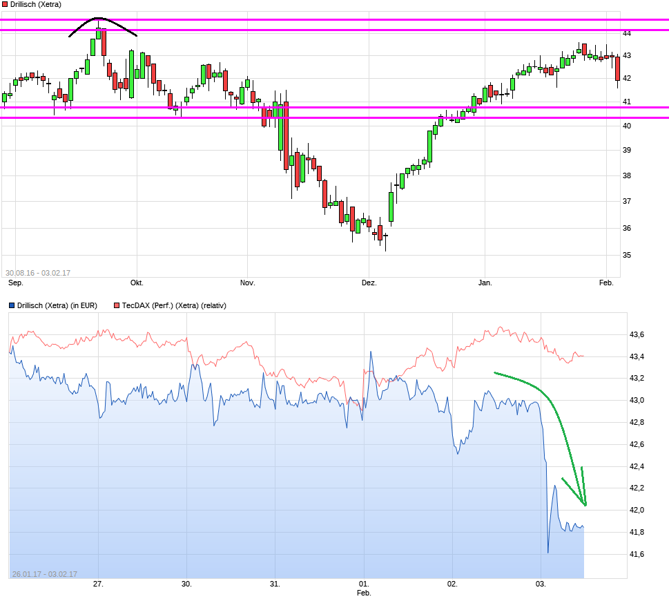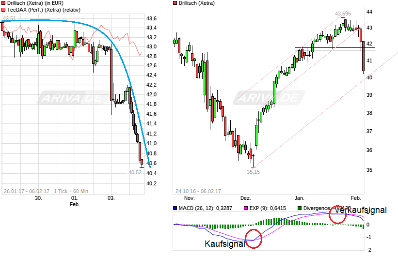 Wenn man lange genug zurückschaut könnte man auch z.B. sagen 5-8€ Korrektur wäre "normal", weil es das auch oft genug schon gab ;) Mit Volatilitäten muß man bei dem Wert nunmal leben, weil bei diesem Wert traditionell besonders viele Zocker/Trader auf- und abspringen und/oder Musterdepot-Lemminge von Kulmbach&Co. gescheucht und gemolken werden in gewissen Abständen, u.a. mit "alternativen Fakten (wie z.B. damals mit dem "uneigennützigen" Märchen UI übernimmt DRI). Vielleicht ist es auch weniger die absolute Größe um die man jetzt von jüngsten Top aus gesehen schon wieder korregiert was manchen Anleger nervös macht, sondern eher das deutlich erhöhte Korrekturtempo dabei gegenüber dem Gesamtmarkt. Wären jetzt übrigens schon 3€ "Normalität". Drillisch ist wie ja so gut alle Aktienwerte durch den Mega-Run der Börsen seit der Trump-Wahl in klar überkaufte Gefilde gekommen. Insofern war es wohl überfällig auch mal wieder auszuatmen, zumal inwischen eine ambitionierten Bewertung erreicht war und die DiviRendite für einen TelkoWert auch nicht mehr so prall war bei 43+x. Da nimmt mancher flexible Anleger, der guten Gewinn gemacht hat seit November, jetzt lieber etwas Geld vom Tisch, falls am Ende "normale " Zahlen/Prognosen bei DRI nicht mehr gut genug sind das Pferdchen am laufen zu halten, wenn vorher zuviel schon eingepreist wurde. Kommt jetzt eben darauf an, ob der Gesamtmarkt ebenfalls nochmal etwas mehr zum durchatmen neigen wird die nächste Zeit und natürlich wie die Zahlen/Prognosen von DRI wirklich sein werden. Sollte der Gesamtmarkt die nächste Zeit eher stabil/nur leicht fallend sein (DAX z.B. weiter über der Region um 11430 bleiben) und DRI selber nichts negatives vermeldet bis zu den Zahlen, dann würde ich auch erstmal damit rechnen, daß im Bereich 38/40 schon wieder die Konso vorbei ist. Ausschließen, daß es tiefer geht kann man natürlich nie. Besonders, wenn ein Elefant wie Trump im politischen Porzelanladen seine Runden dreht. Vielleicht prallel auch ein Auge auf dem MACD lassen. Wenn der irgendwann wieder klar nach oben kreuzt, dann könnte es vielleicht das Signal sein die Konso wäre damit vorbei. Je mehr der MACD jetzt aus dem überkauften Bereich noch läuft, desto "ausgeruhter" könnte man dann vermutlich wieder starten. Von daher bislang alles noch kein Beinbruch. Aber auch noch kein Signal zu sehen die Konso wäre schon wieder wirklich vorbei oder der finale Tiefpunkt erreicht.