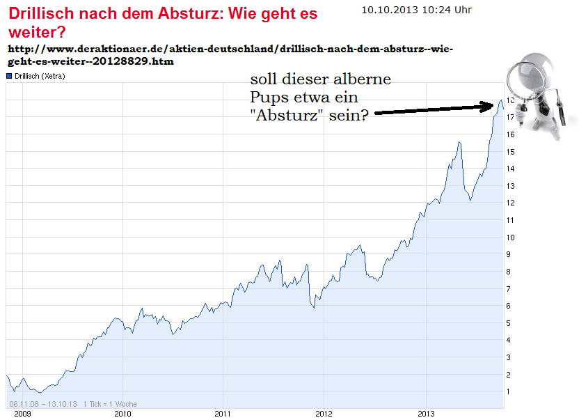 Sonderdividende läuft doch schon ;) Wird jedoch unter dem Deckmäntelchen der regulären Divi rausgehauen. ( => http://www.ariva.de/news/...uro-Aktie-Vorjahr-0-70-Euro-Aktie-4474290 ). Oder glaubst du die zuletzt ausgeschütteten 1,30 wären nur aus dem 2012 erwirtschaftem operativen Gewinn gekommen? Es wird halt in gewissen Salamiescheiben ein Großteil der einmaligen Sondergewinne aus den FNT-Anteilsverkäufen über die kommenden Jahre regulär ausgeschüttet. Daher fällt es DRI auch leicht die kommenden Jahre mindestens 1,30 als Divi zu garantieren. Dafür wäre nichtmals ein sonderlich gut laufendes operatives Geschäft von Nöten. Für mich sind Divis ja bekanntlich irrelevante Zirkusnummern und Blendgranaten. Ist am Ende eher ein Nullsummenspiel, da anschließend der Kurs erstmal um den Betrag fällt um den das Vermögen pro Aktie sinkt nach dem Cashabfluß. Von daher brauche ich keine Divis und bin mehr an Kursanstiegen interessiert. Zudem zerhauen zu hohe Divis oftmals bestehende Trendkanäle und bringen anschließend weitere Kursrücksetzer mit sich. An Divis kann man als Management wunderbar rumzaubern. Man sieht an einer Divi nicht wie es wirklich um der Gewinn einer Firma steht, weil man die Ausschüttungsquote nach belieben hoch oder runterfahren kann oder gar aus der Substanz ausschütten könnte. Daher sollte ein Anleger sich weniger nur durch irgendeinen Nonsens wie DiviRendite in ein Investment treiben lassen, sondern sich in erster Linie darauf fokusieren was nachhaltig wirklich verdient wird, unabhängig davon was wann ausgeschüttet wird.