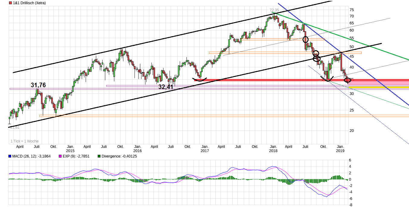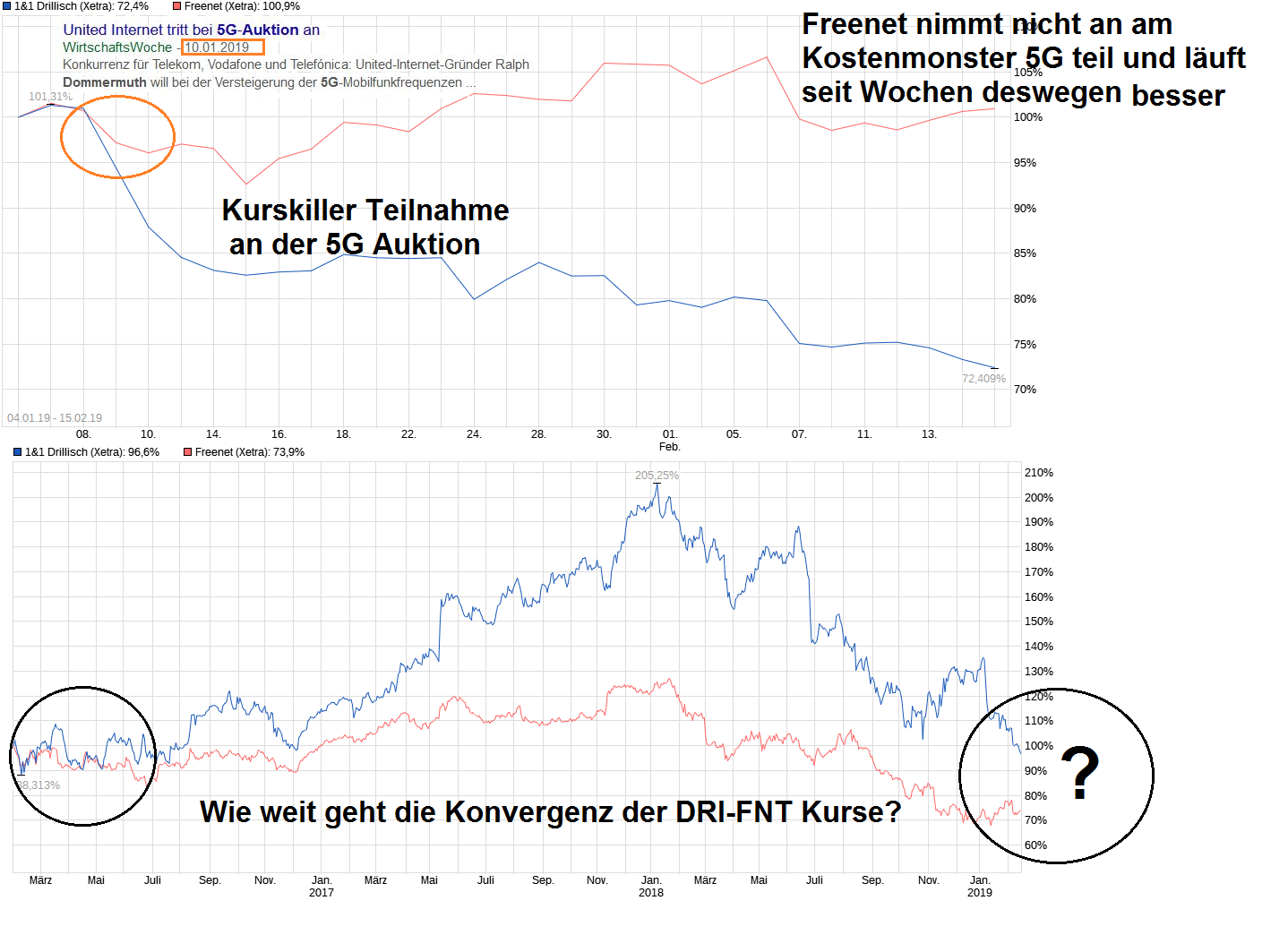 Sogar tiefster Kurs seit Sommer 2016. Da man ja bei der Aktie seit längerem in einer Abwärtsbewegung ist und immer wieder alte Unterstützungsmarken fallen, die dann nicht nachhaltig zurückerobert werden, wäre es nicht verwunderlich, wenn Drillisch nach dem Break des Bereichs um die 34,40 nun auch noch die nächsttiefere Unterstützungen anlaufen würde (eventuell mit einem Pullback zuvor nochmal an die jüngst gebrochene Marke), die im Bereich um 31,76/32,42 lägen. Da käme man in Regionen in denen die UI-Aktie bereits angekommen ist, die ebenfalls parallel abstürzt, weil deren Beteiligungsportfolio um eine Milliarde nach der anderen wegschmilzt und die 5G Geschichte durch DRI indirekt auch voll auf den DRI Hauptaktionär durchschlägt. Enorme Kostenbelastungen, Druck auf künftig Dividenden, hohe Neuverschuldung und/oder große KE sind dadurch zu erwarten. Ob und wann sich das alles auszahlen könnte steht in den Sternen. Erstmal werden jetzt wohl einige Jahre anstehen wo reinzubuttern ist. Da gehen flexible Anleger schon länger raus und suchen Alternativen die bessere Perspektiven haben bzw. die nicht vor einer operativen Durststrecke stehen durch übermäßigen Investitionsbedarf. Keine Ahnung ob und wenn ja wie tief es Drillisch noch zieht. Allerdings trifft das auch nicht nur Drillisch, sondern quasi alle Provider-Aktien leiden seit Sommer 2018 schon unter diesem Thema. Eine Telefonica Deutschland fällt auf neue Allzeittiefs, obwohl sie eine deutlich bessere DiviRendite hat als Drillisch. Zeigt also diese Branche ist weiterhin nicht angesagt und die nächste Divi dem Markt offenbar nicht reizvoll genug um deswegen alleine zu kaufen/ zu halten. Muß man eben abwarten wann sich das mal wieder ändert.