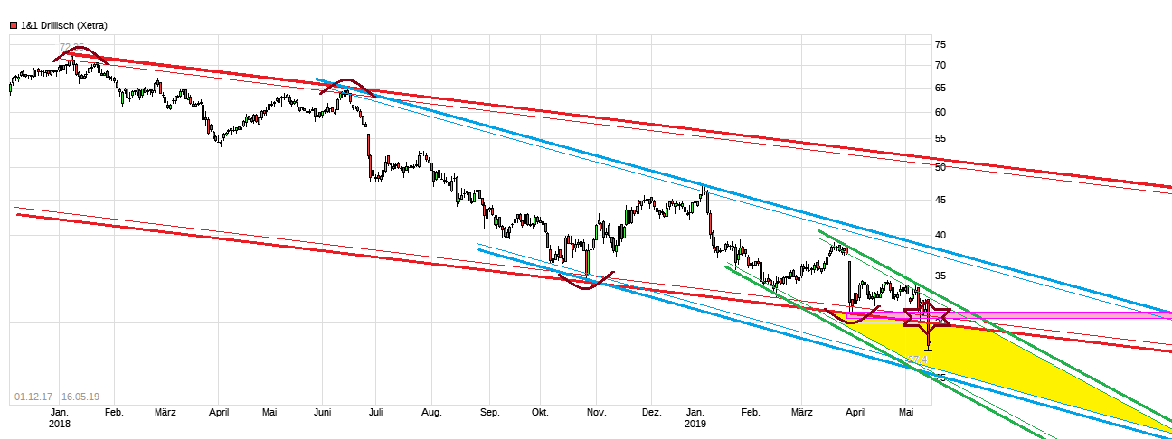 Für eher kurzfristig denkende Hebelzocker, denen schon ein oder zwei Euro Bewegung in die eine oder andere Richtung reichen, ist das vielleicht egal, wenn da schon wieder der Deckel wäre. Aber abgeklärte Long-Investoren, die nicht krampfhaft immer versuchen genau das absolute Tief zu erwischen, könnten jetzt erstmal abwarten, ob man wichtige Widerstandsmarken wieder NACHHALTIG zurückerobert, in deren Nähe man nach einem Kauf dann z.B. ein SL legt als Absicherung für den Fall es gibt doch keine nachhaltige Erholung, anstatt jetzt schon in das fallende Messer zu greifen. Hier könnte es nämlich in den kommenden Wochen durchaus auch noch in Richtung 25 oder tiefer weitergehen. Fakt ist ja, daß DRI kein gutes Q.1 hatte und die Markterwartungen um 7% verfehlt hat. Daher ja auch in erster Linie gestern der Einbruch. Was wenn auch Q.2 zeigt, daß das Geschäft nicht so läuft wie gewünscht? Und die endlose, immer teurer werdende 5G Auktion trägt auch nicht zu Belebung des Sentiments bei DRI bei. Dazu noch ein Dommermuth-Malus , d.h. ein Management-Abschlag, da man dem Mann völlig ausgeliefert ist, der in den letzten Jahren nurnoch durch eine Serie von Fehlinvestments negativ aufgefallen ist und bei UI ständige Wertberichtungen das Bild seit längerem immer wieder prägen. Dazu die Aussicht durch hohe 5G Investitionen in den kommenden Jahren nichtmals ansatzweise an alte DiviRenditen zu kommen, was massig andere TelkoAktien so direkt nun deutlich interessanter macht für Leute denen Divi wichtig ist und die gedanklich flexibel sind.