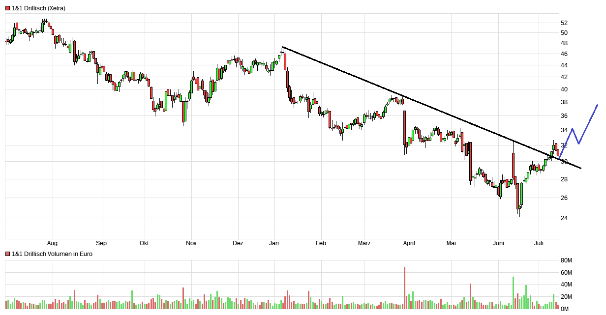 Leider kommt bei Drillisch noch die Dividendenkürzung auf 5 Cent hinzu. Das hat viele Kleinanleger vergrault. Nur bin ich mir fast sicher, dass die Dividende nächstes Jahr wieder auf das vorher übliche Niveau angepasst wird. Auch UI kann sich das nicht leisten dauerhaft auf die Dividende von Drillisch zu verzichten.
