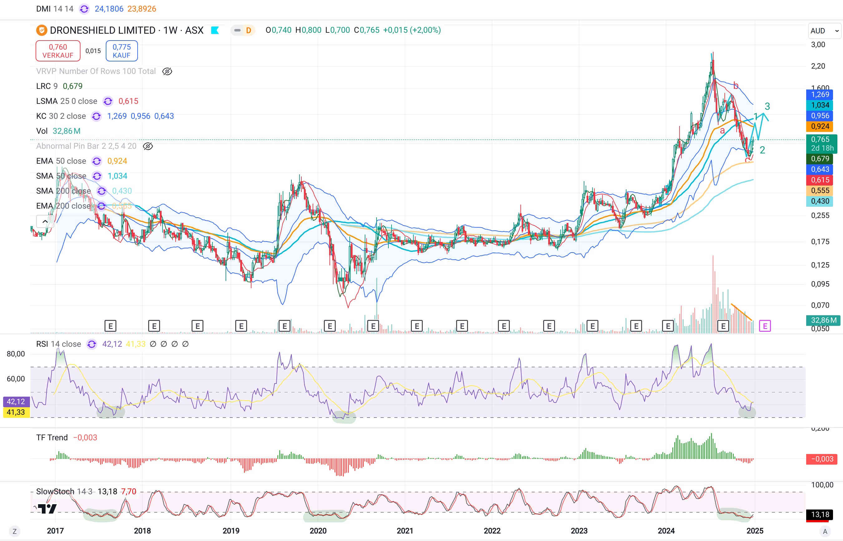 2. die seit Wochen extrem stark überverkaufte Situation der DroneShield-Aktie. D.h. das Gummiband wurde sehr stark nach Unten gespannt, das Handelsvolumen nahm deutlich ab, somit auch der Verkaufsdruck. Die die verkaufen wollten haben längst verkauft, so dass jedes steigende Kaufinteresse kaum auf bereitwillige Verkäufer trifft.