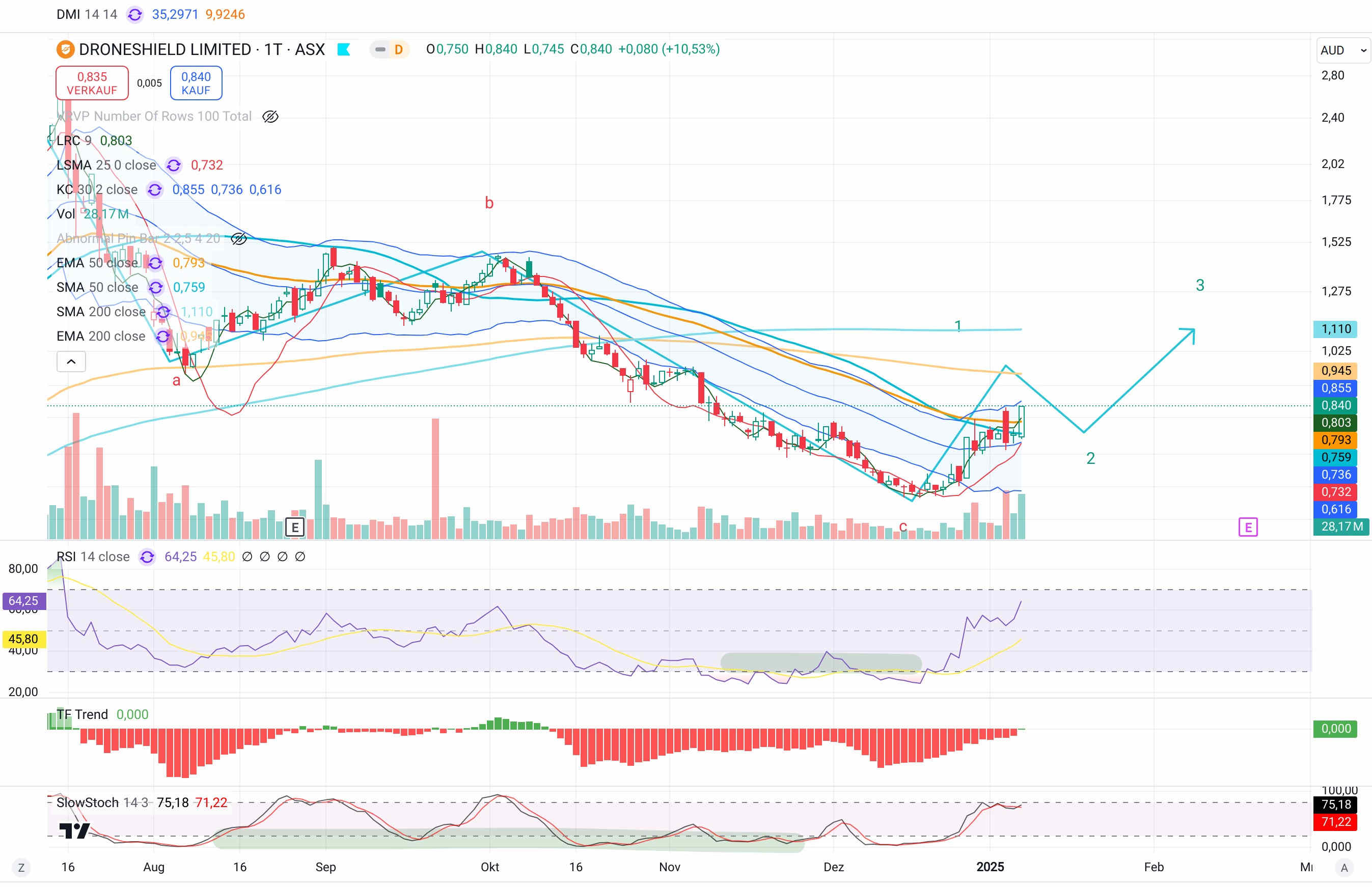 Und aus Sicht eines Long-Positionierten ist ein Verkauf auf dem aktuellen Niveau wahrscheinlich nicht mehr attraktiv genug, weil die Unterstützung um die 0,42€ liegt, im Eurochart sogar nahe der 0,44€.