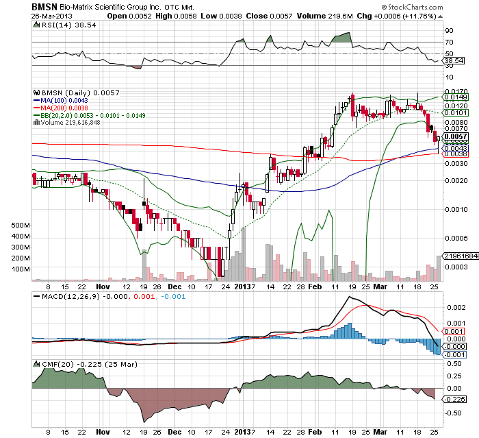 Bio-Matrix Scientific (BMSN) To Begin Clinical Trials Of HemaXellerate Late April 2013_Projects Biotech News Stock Review. Johnny is hearing that an official announcement will come from BMSN in mid to late April heralding the all clear for clinical trials to begin. In the meantime watch for shorting of this stock to continue for another 10 days or so before the shorts cover and the short interest diminishes as the potential for a major short squeeze will increase as we approach mid April. Then both Adam and I believe this stock is going to hit new highs!!