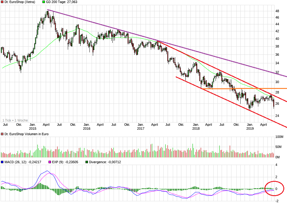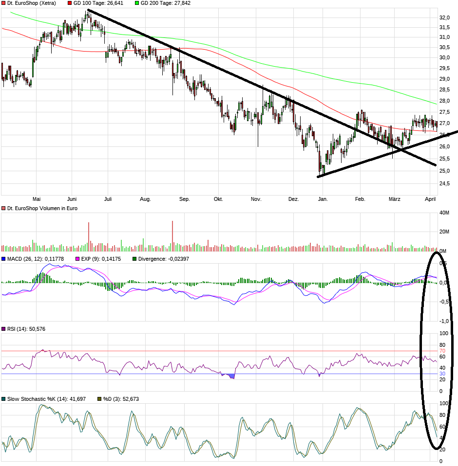 Der Chart scheint einen Boden auszubilden, die GD100 ist genommen, nun auch noch GD38 positiv und GD200 (27,36 €) in in Reichweite. Außderm haben sich zuletzt die Bollinger Bänder stark eingeengt, was oftmals als Vorbote für Richtungsentscheidungen angesehen wird.
