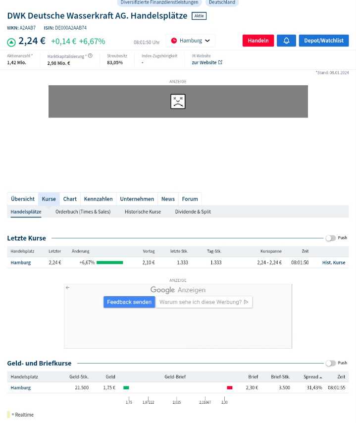 Die beiden Vorstände haben Aktien ausserboerslich zu EUR 0,35 gekauft - vermutlich von einem Großaktionär. Dagegen ist grundsätzlich nichts einzuwenden, da wir Vertragsfreiheit haben und jeder diesbezüglich frei ist, zu welchem Preis er seine Aktien verkauft bzw. Aktien kauft. Und wenn das Geschäft nicht über die Börse läuft, werden manchmal andere Preise als die an der Börse gezahlten Preise vereinbart. Auch dafür, dass der Vorstand so günstig an die Stücke gekommen ist, wird es Gründe geben, diese sind aber nirgends einsehbar. Aber Herr Moffat oder ein anderer der Großaktionäre wird sicher einen guten Grund gehabt haben, die Stücke günstig an die neuen Vorstände, die sicherlich zu großen Teilen für den künftigen Erfolg der DWK verantwortlich zeichnen (und nun auch noch ihre Firma Antares Hydropower AS einbringen) abzugeben.