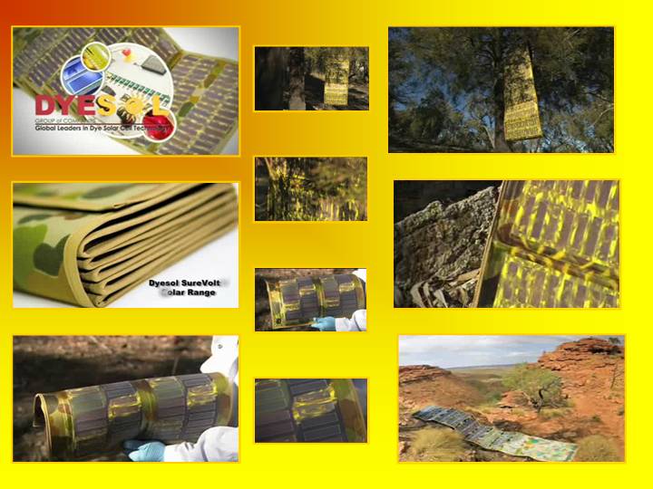 beschreiben, bei der ein Elektrolyt, eine Schicht Titandioxid (ein in weißer Farbe und Zahnpasta verwendetes Pigment) und ein Ruthenium-Farbstoff benutzt werden, die zwischen Glas eingelegt sind. Durch Lichteinfall in den Farbstoff werden Elektronen angeregt, die vom Titandioxid absorbiert werden. Dabei entsteht ein elektrischer Stromkreislauf, der um ein Vielfaches stärker ist als der, der sich bei der natürlichen Photosynthese in Pflanzen ergibt. Im Vergleich zu herkömmlicher photovoltaischer Technik auf Siliziumbasis sind bei Dyesols Technologie die durch die Herstellung entstehenden Kosten und die graue Energie niedriger, und selbst bei schwachen Lichtverhältnissen wird Elektrizität effektiver produziert. Außerdem kann sie durch das Auswechseln konventioneller Verglasung direkt in Gebäude integriert werden, anstatt Dachflächen oder zusätzliche Grundstücksareale erforderlich zu machen.