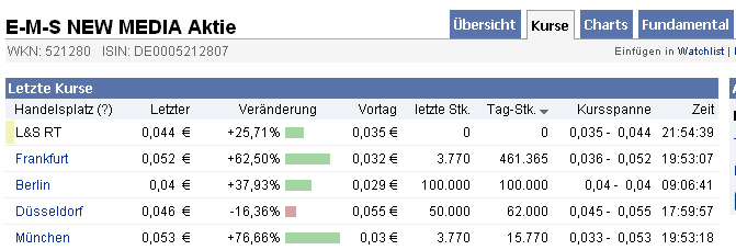 | 12 | 2.250 | e-m-s new media ag jetzt rein!! | geheimtipper | Timo1986 | 20.01.12 11:37 | |