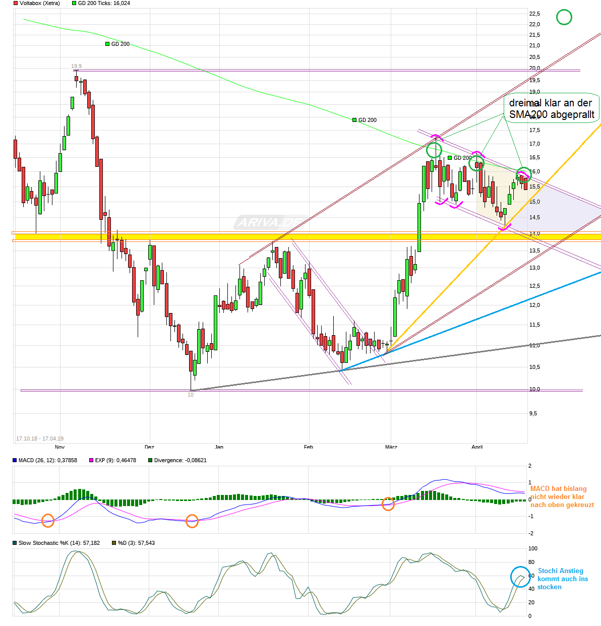 Klar wäre es schön gewesen, wenn man darüber geblieben wäre. Aber bei der kurzfristig erreichten extremen Überkauftheit (man schaue auf die Höhe in der sich Indikatoren wie MACD und Stochatik bewegen) und dem starken Anstieg in kurzer Zeit, wundert es nicht so wirklich, daß man es nicht geschafft hat auch gleich noch die 200er klar zu nehmen und dann auch noch NACHHALTIG zu verteidigen. Die 200er hatte man auch schon im letzten August mehrfach angekitzelt, aber dann auch nicht nachhaltig überwunden. Scheint hier also eine etwas hartnäckige Linie zu sein bei dem Wert. Da muß jetzt eben wieder zwischendurch ausgeatmet werden bwz. finden dann auch Gewinnmitnahmen statt.