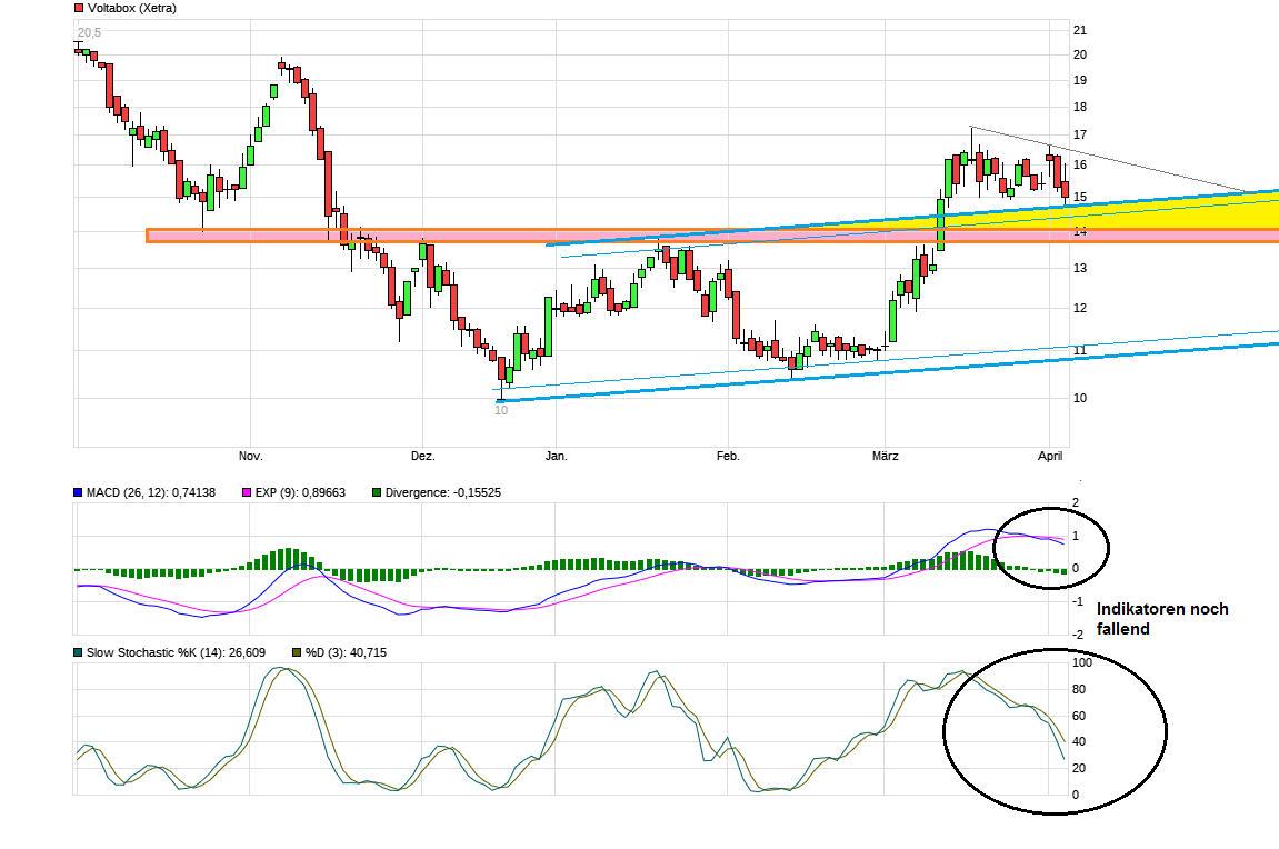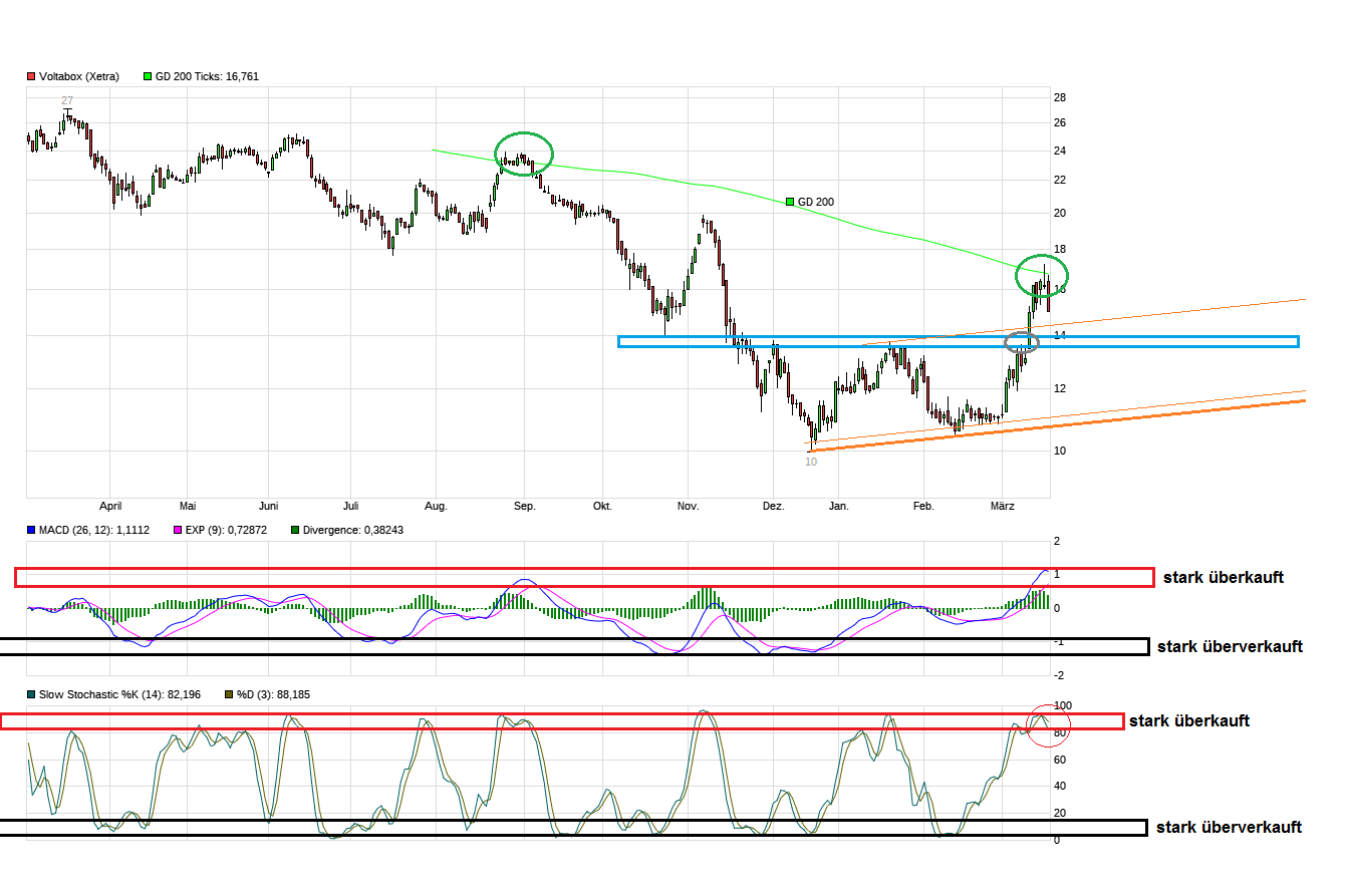 Man darf nicht vergessen, daß der Voltabox Kurs in nur wenigen Wochen um ca. 50% fahnenstangenartig angestiegen ist ohne das Voltabox nun wirklich Megazahlen abgeliefert hat. Die Zahlen waren schon o.k., aber auch kein Grund nach oben nun immer weiter wegzurennen als gäbe es kein Morgen mehr. Konso wäre nicht ungesund solange man nicht wieder nachhatig in die jüngst überwundenen Doppelboden-Formation zurückfällt. Sollte man also z.B. einen Pullback machen an die jüngste Ausbruchregion, dann wäre alles erstmal technisch noch weiter o.k. . Muß aber natürlich nicht zwingend ein Pullback geben und man fängt sich dann halt etwas höher wieder.