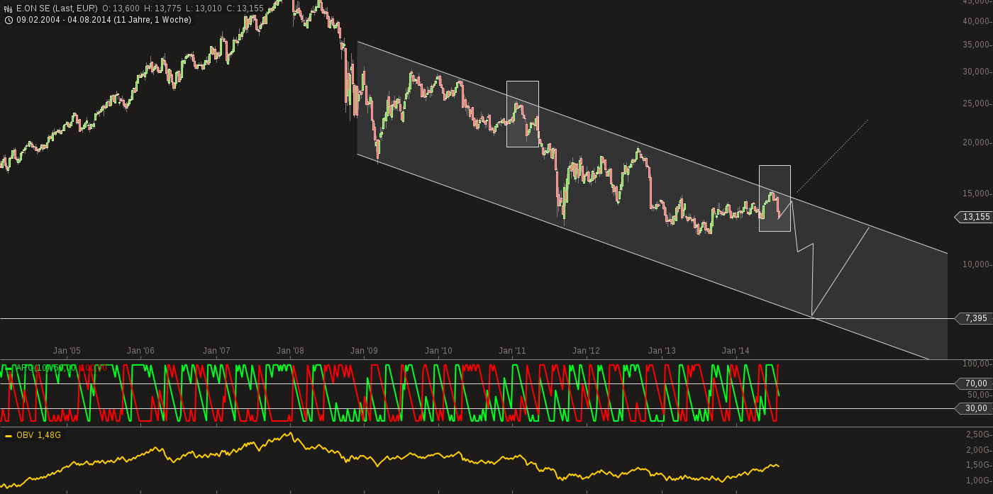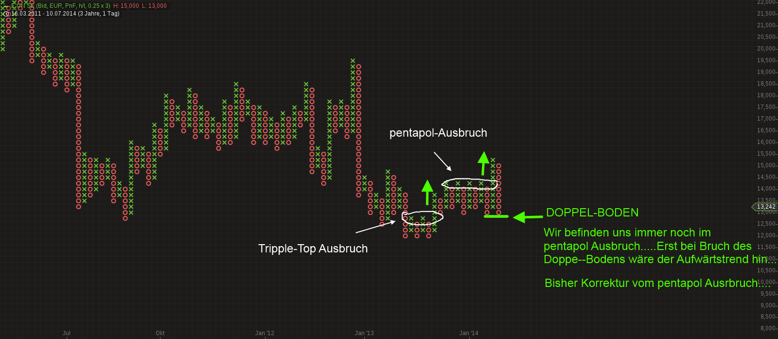 ...demnach ist es bisher Doppel-Boden...erst, wenn da ein weiteres "o" dazukommt, ist der Trend, der sich seit dem Kurs bei 12 gebildet hatte, pfutsch....was der Linienchart dann zeigt, ist ein urzfristiger kleiner Fake-Ausbruch....erst wenn diese beiden Darstellungen übereinstimmend nach unten zeigen, würde ich dann von einem endgültigen Bruch sprechen...
