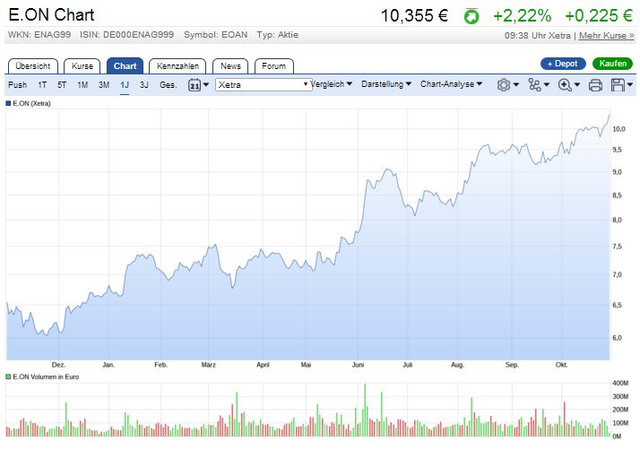E.ON hat ein ganz wichtiges Zeichen gesetzt. Zum Wochenausklang konnte die Aktie das bisherige 2-Jahres-Hoch angreifen und schließlich überwinden. Dies lag bei 10,06 Euro. Damit konnte auch die bedeutende 10-Euro-Grenze gehalten und letztlich sogar etwas distanziert werden. Diese Untergrenze garantiert nach charttechnischer Auffassung im Aufwärtstrend die Fortsetzung des Anstiegs, der sich seit dem Frühjahr in mehreren Etappen vollzogen hat. Der Kurs wird selbst bei einem Rutsch gleich mehrere Haltezonen vorfinden, sodass die Entwicklung nach unten gut abgesichert sein dürfte. Auch an diesem Montag konnte die Aktie weiter zulegen und das 2-Jahres-Hoch auf 10,13 Euro stellen.