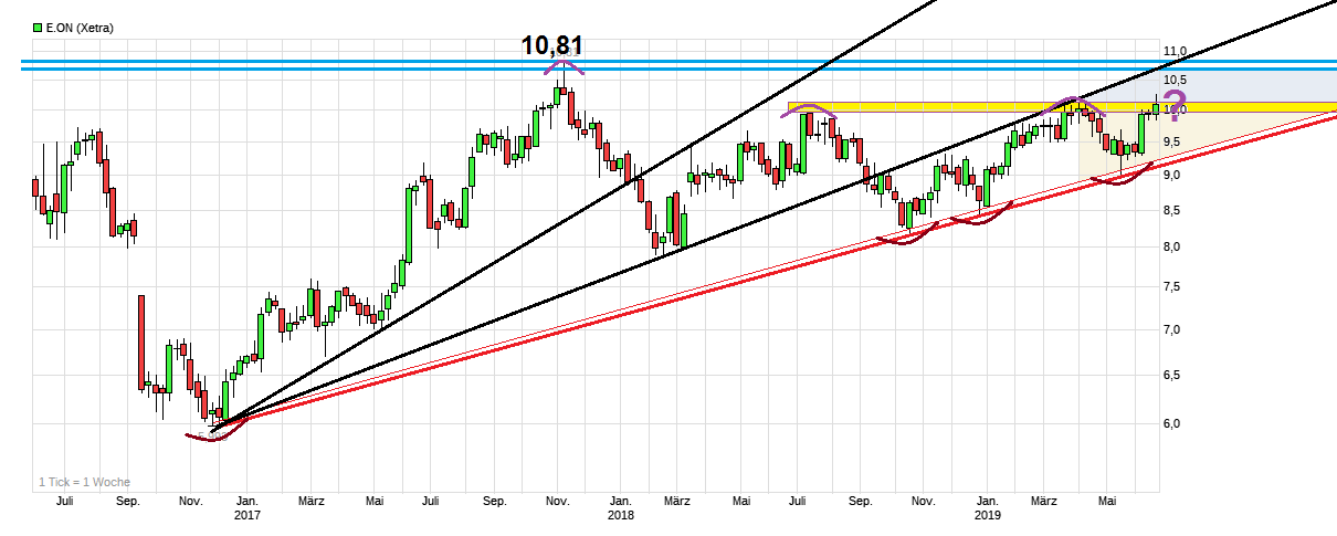 Wichtig wäre für den E.ON Chart jetzt kurzfristig endlich die Marke um 10,00/14 nachhaltig rauszunehmen, um dadurch weitere Luft zu bekommen Richtung 10,81. Am Freitag ist großer Verfallstag. Vielleicht gibt es ja gewisse Marktteilnehmer die den Kurs bis dahin lieber erstmal weiter nahe an einer glatten 10 noch sehen wollen anstatt vorher den Kurs jetzt von der Leine zu lassen Richtung 10,81. Mal schauen was wirklich passiert.